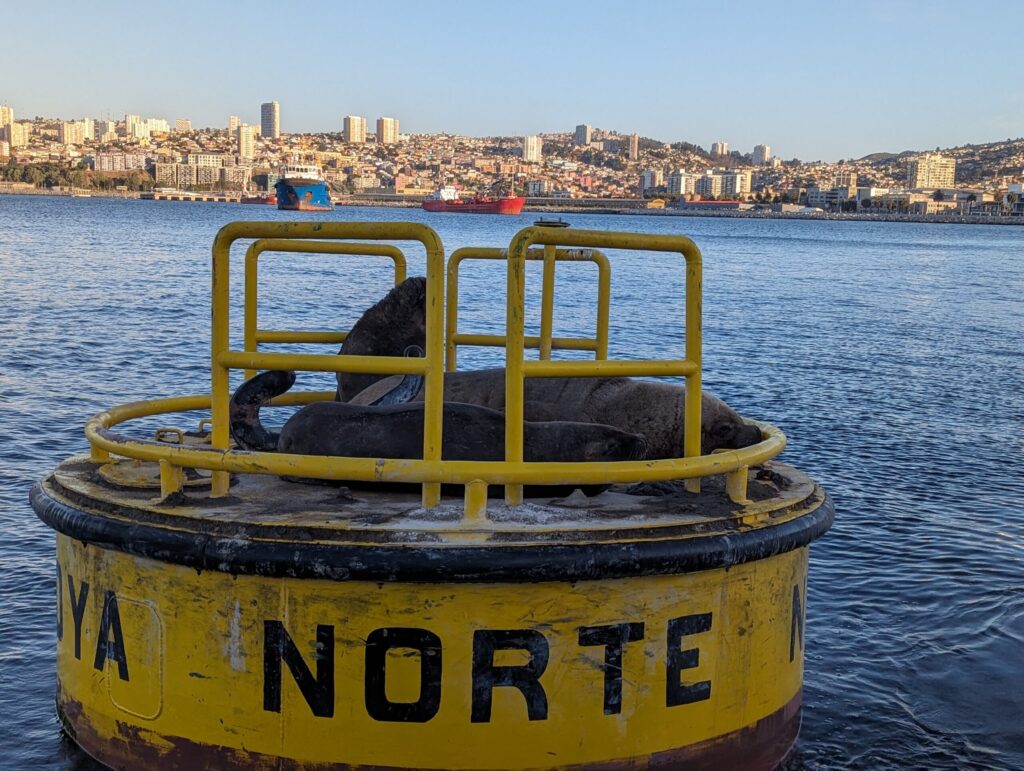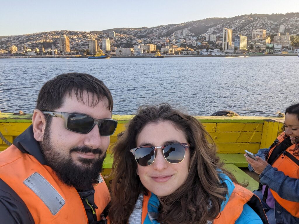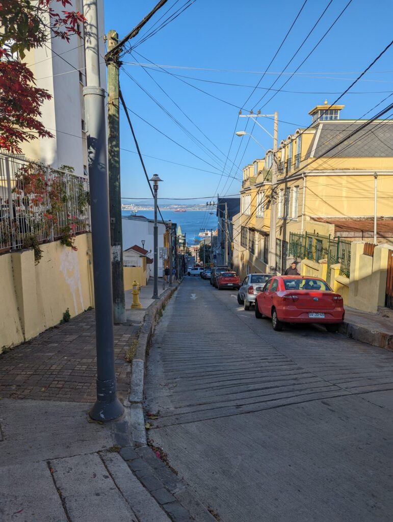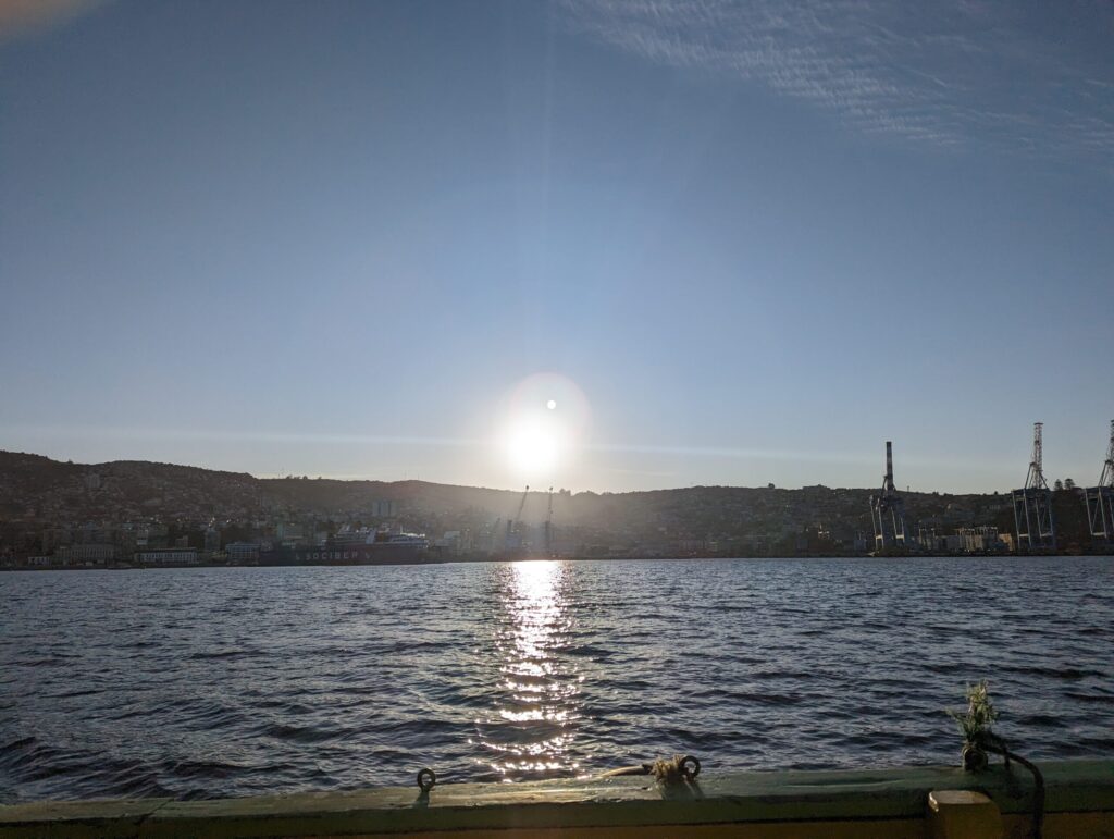 Il est 19 h, et on décide de sortir un peu profiter de notre première soirée à flâner dans la ville puis aller faire un tour de bateau. Notre Air Bnb se situe en hauteur dans un Cerros, on descend donc la colline pour se diriger vers le port. Les couleurs et le charme de la ville nous sautent tout de suite aux yeux ! (Pour info, toutes les routes sont à double sens, et il est de coutume d’accélérer dans la descente !) La ville étant un ensemble de collines, il peut devenir compliqué de s’y déplacer, il y a donc quelques ascenseurs urbains qui permettent, pour 10 centimes, de s’économiser pas mal d’effort !