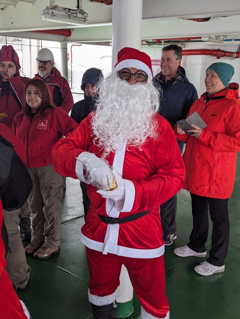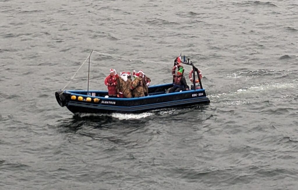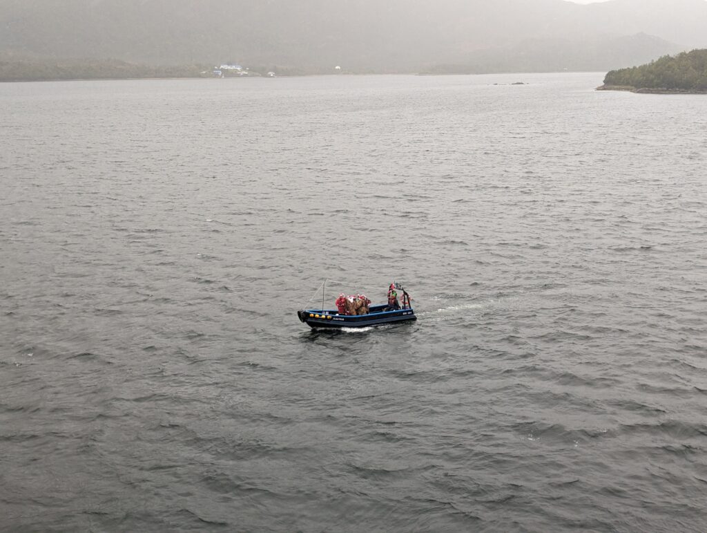 10 h, on arrive enfin à Puerto Eden. Il me semble que normalement le ferry est attendu car il sert de transporteur pour le village, mais aujourd’hui c’est nous qui avons une surprise, la venue du père Noël… en bateau !