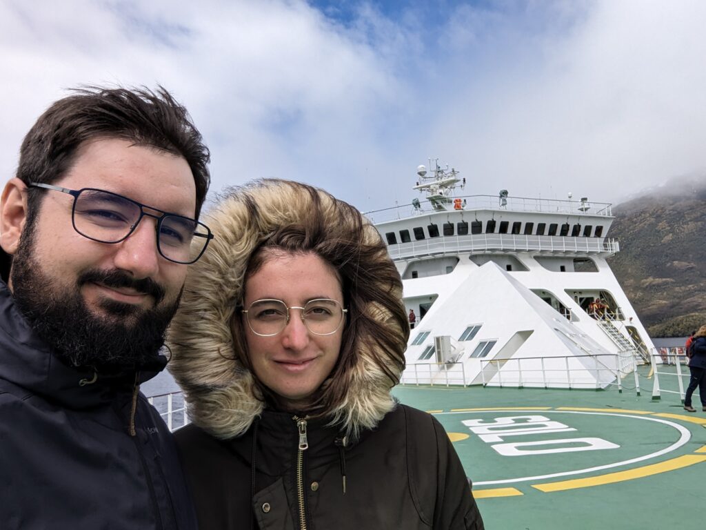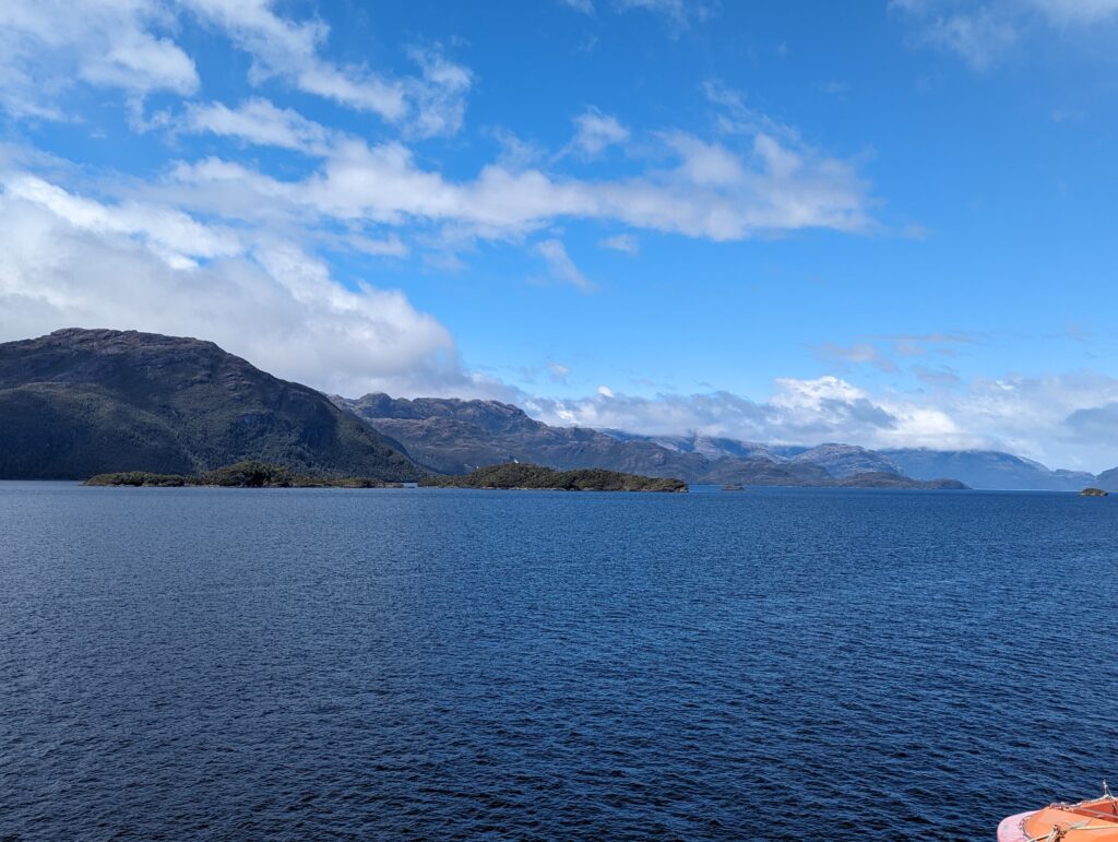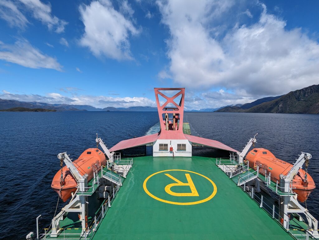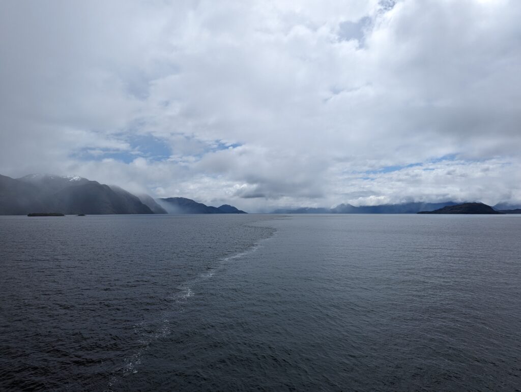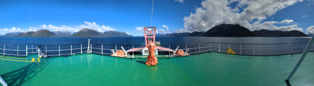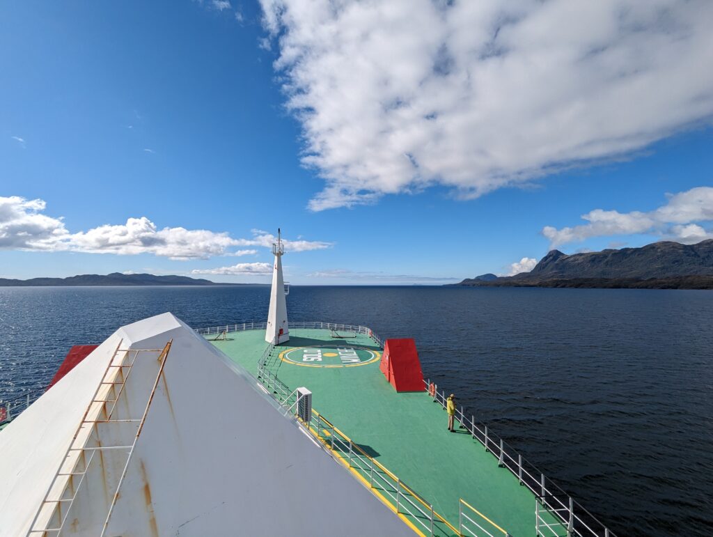On sort de la cabine, et on découvre une plateforme accessible qui donne une vue à 180° sur l’arrière du bateau. C’est devenu notre coin préféré, et j’y passe les 3 prochaines heures à regarder les fjords défiler. Surtout que le temps s’est largement amélioré !