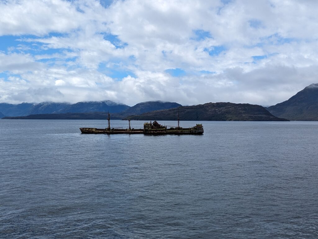Pour celle visible, c’est un navire marchand qui transportait du sucre vers Valparaiso dans les années 60. Mais il avait tout vendu à Punta Arenas sans rien dire. Afin de toucher l’argent de l’assurance, le capitaine a voulu couler le bateau. Mais il s’est raté et a heurté un rocher plat, et donc le bateau n’a pas coulé. Et l’assurance était très contente de ne pas trouver de sucre à bord, et donc de ne rien avoir à rembourser !