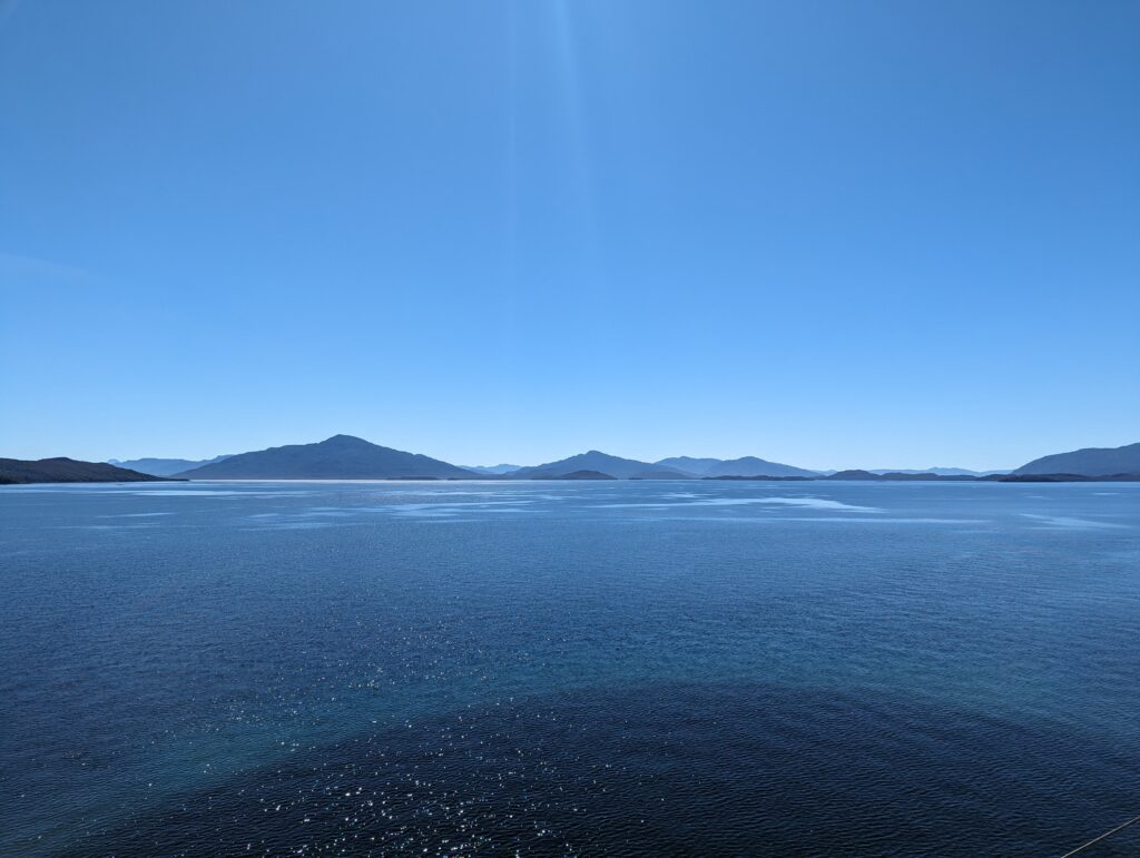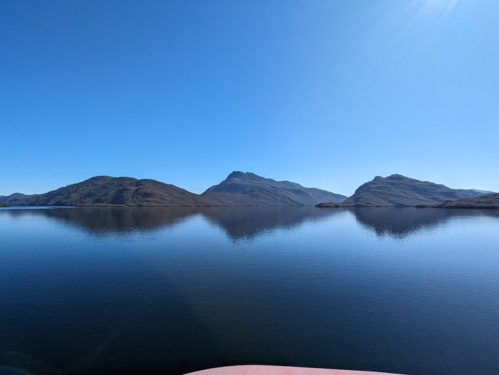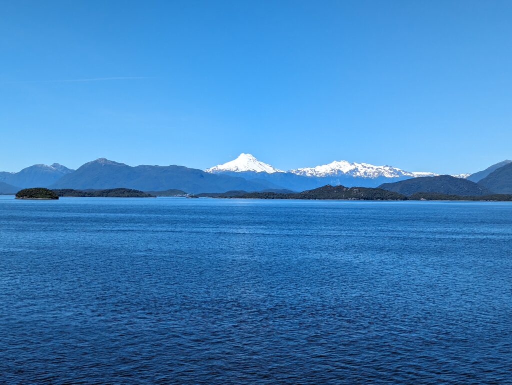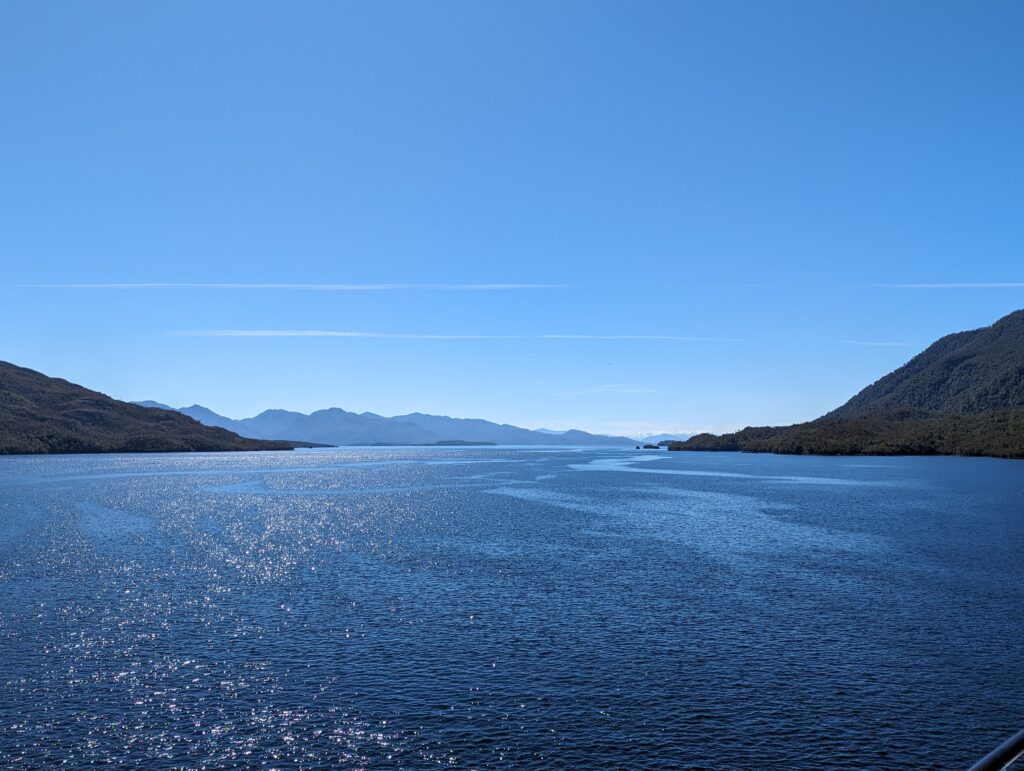 On retourne finir le thé, mais malheureusement il a été ramassé… :/ mais bon, pas trop le temps de pleurer sur son sort, le capitaine annonce un nouveau canal digne d’intérêt peu de temps après. On va à l’avant du bateau, et là on se retrouve sur une mer sans vague, dans un silence presque religieux, sans un nuage, sans vent, au milieu de paysages magnifiques.