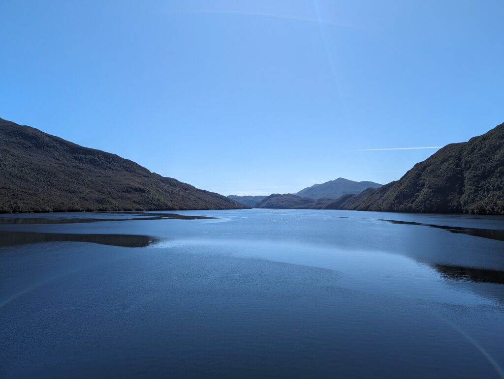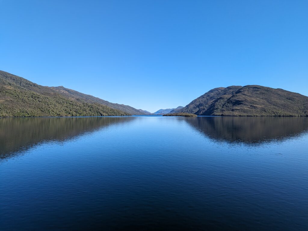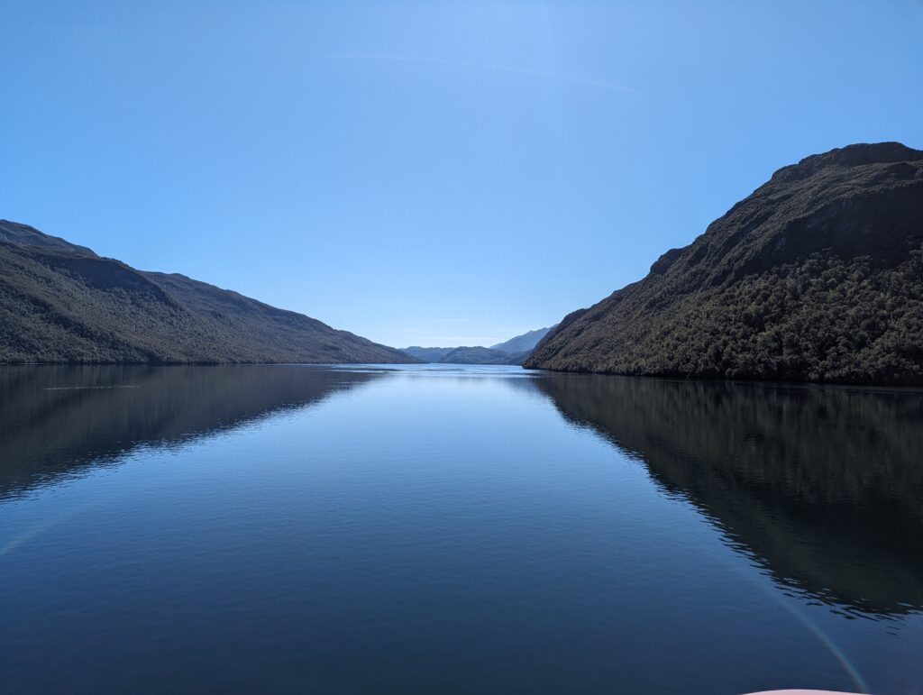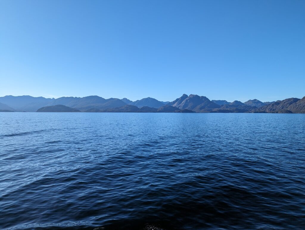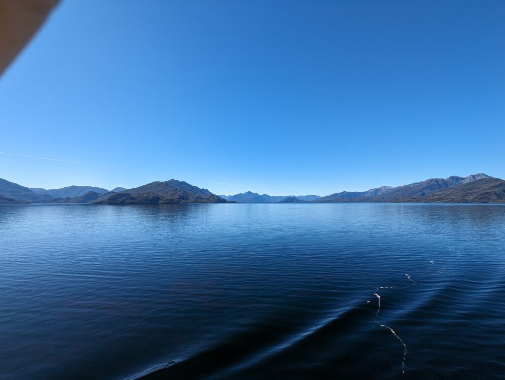 On retourne finir le thé, mais malheureusement il a été ramassé… :/ mais bon, pas trop le temps de pleurer sur son sort, le capitaine annonce un nouveau canal digne d’intérêt peu de temps après. On va à l’avant du bateau, et là on se retrouve sur une mer sans vague, dans un silence presque religieux, sans un nuage, sans vent, au milieu de paysages magnifiques.