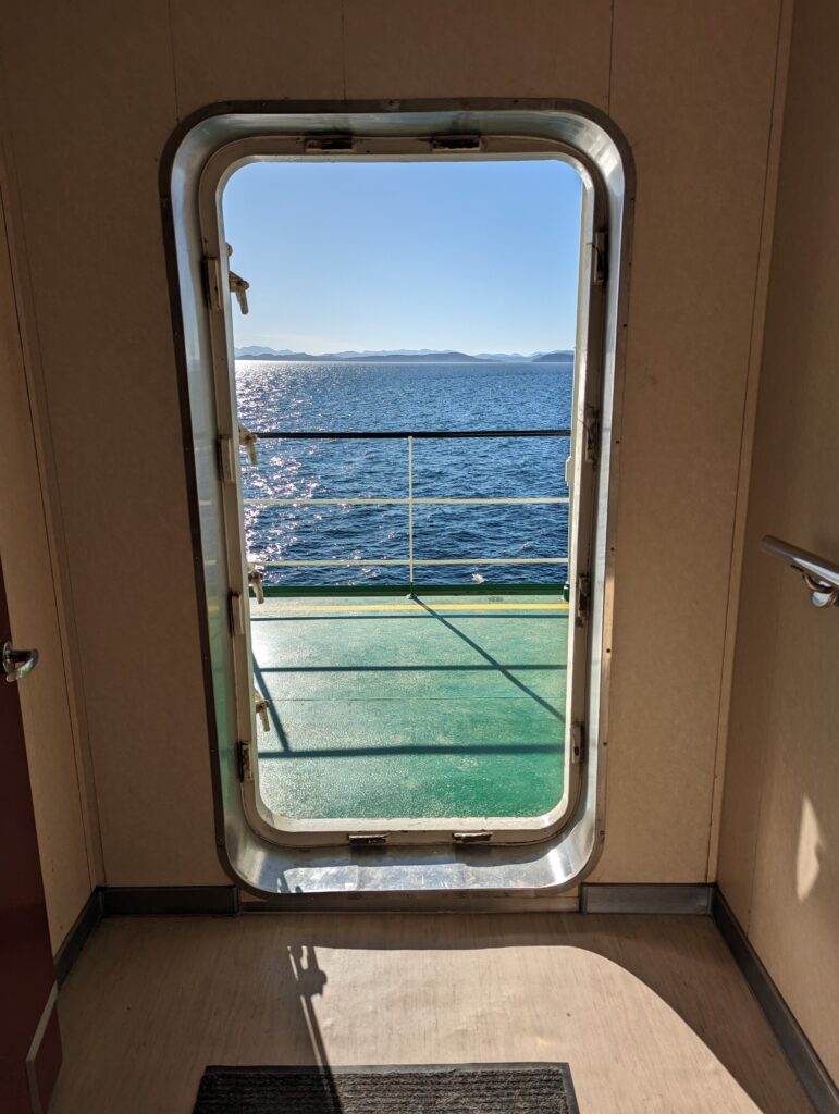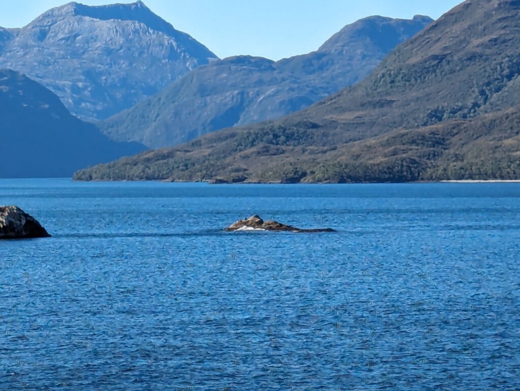 On se réveil, le bateau tangue bien moins que la veille. On commence déjà à retourner dans les fjords (on est passé par l’océan uniquement car il n’y avait pas de connexion à cet endroit dans les fjords). On prend le petit déj, soudain appel du capitaine : « Baleines ! Baleines à l’avant du navire ! » Tout le monde lâche son repas en plein milieu, se précipite à l’avant, je sors mes jumelles que j’ai prises avec moi tout le temps où que j’aille sur le ferry au cas où cette situation exacte se présente.