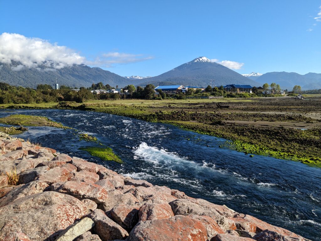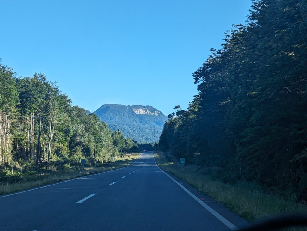 On s’arrête ensuite à la prochaine ville, assez jolie. On fait le plein car on avait lu qu’il fallait le faire dès qu’on pouvait (en fait il y a une station essence tous les 100km et aucune ne semble vide ou surchargée…). On test le pneu. Il est bien dégonflé. On regonfle, roule un peu, s’arrête, regarde le pneu au jugé. Il semble ok. Il nous reste 180km pour Puyuhuapi, notre prochaine destination.