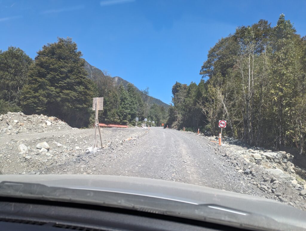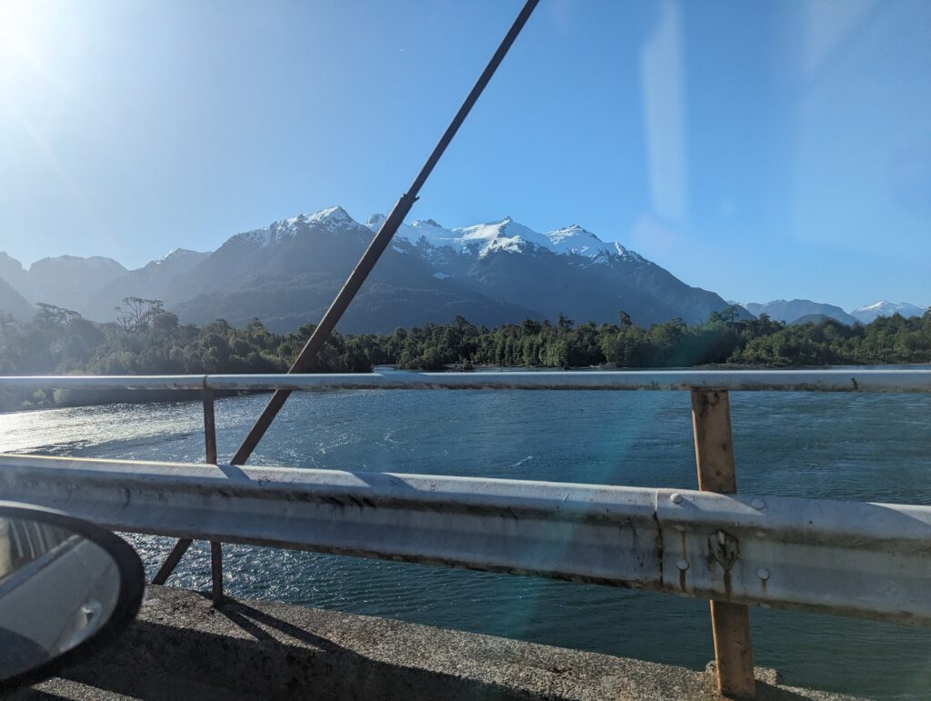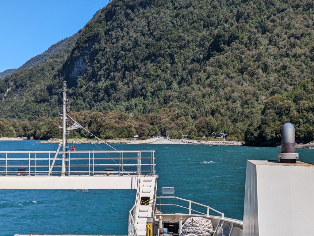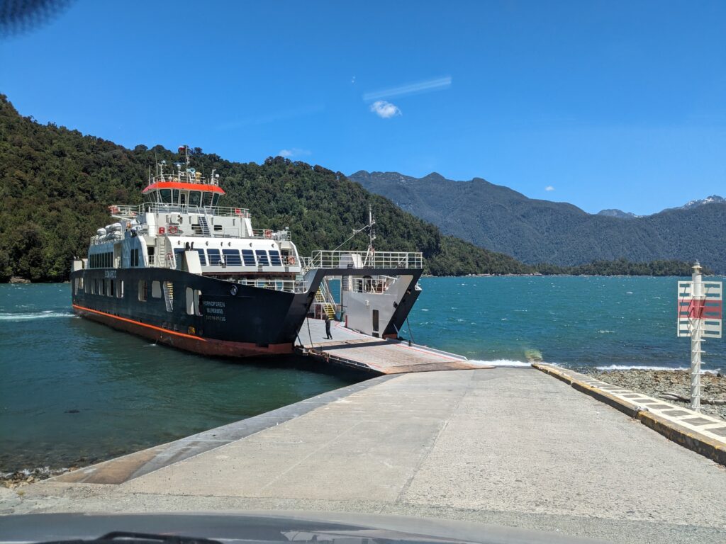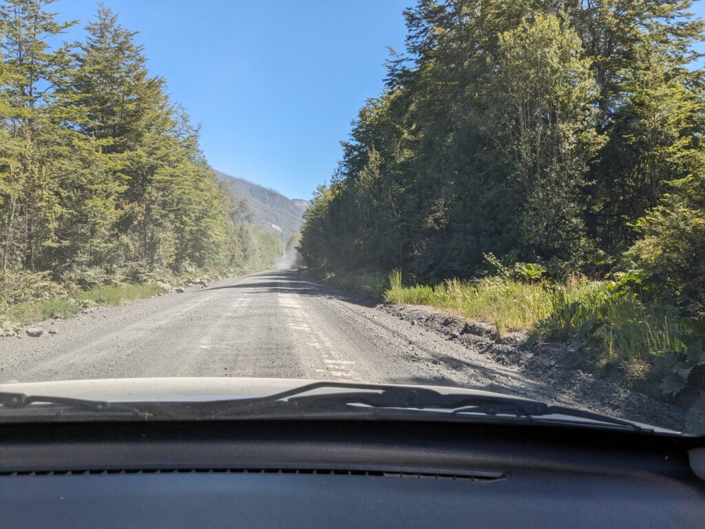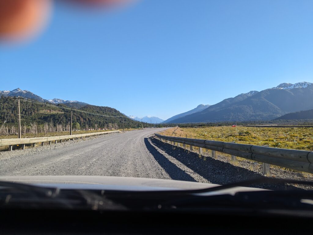Le deuxième ferry pas grand chose à dire non plus. On débarque, Elena prend le volant. On sort, et là on tombe sur du ripio, alors qu’on avait lu que toute la route jusqu’à Coyhaique (à 500km d’ici) était goudronnée…