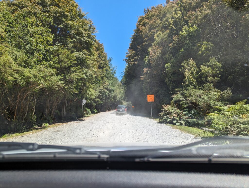 Elena conduit sur du ripio… puis, panneau : travaux sur 14km… Donc le ripio se transforme en du gros gravier et des cailloux. Vous aviez compris l’état de la voiture, sur le ripio ça se passait relativement bien, mais sur le gravier ça bouge beaucoup, ça grince tout autant, la voiture dérape souvent, on entend les cailloux taper, et on est dans le nuage de poussière laissé par les voitures de devant.
