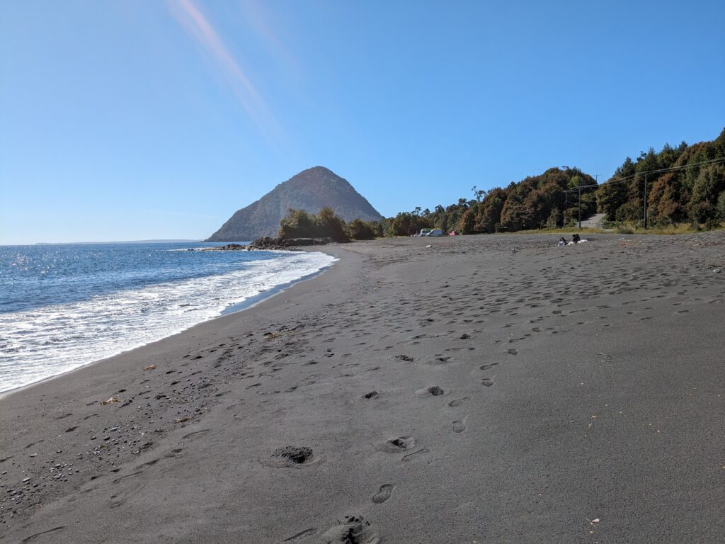 On repart, la route est assez belle, on roule relativement vite sur le ripio (40/50 km/h). On passe par des pont où seul une voiture peut passer à la fois. Et on pense aux camions et bus qui nous on accompagnés sur le ferry et dépassés sur la route des travaux ! Et puis, libération, le retour du goudron ! On s’arrête gouter sur une plage de sable noir. Check du pneu, il parait un peu dégonflé.