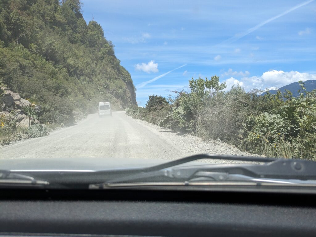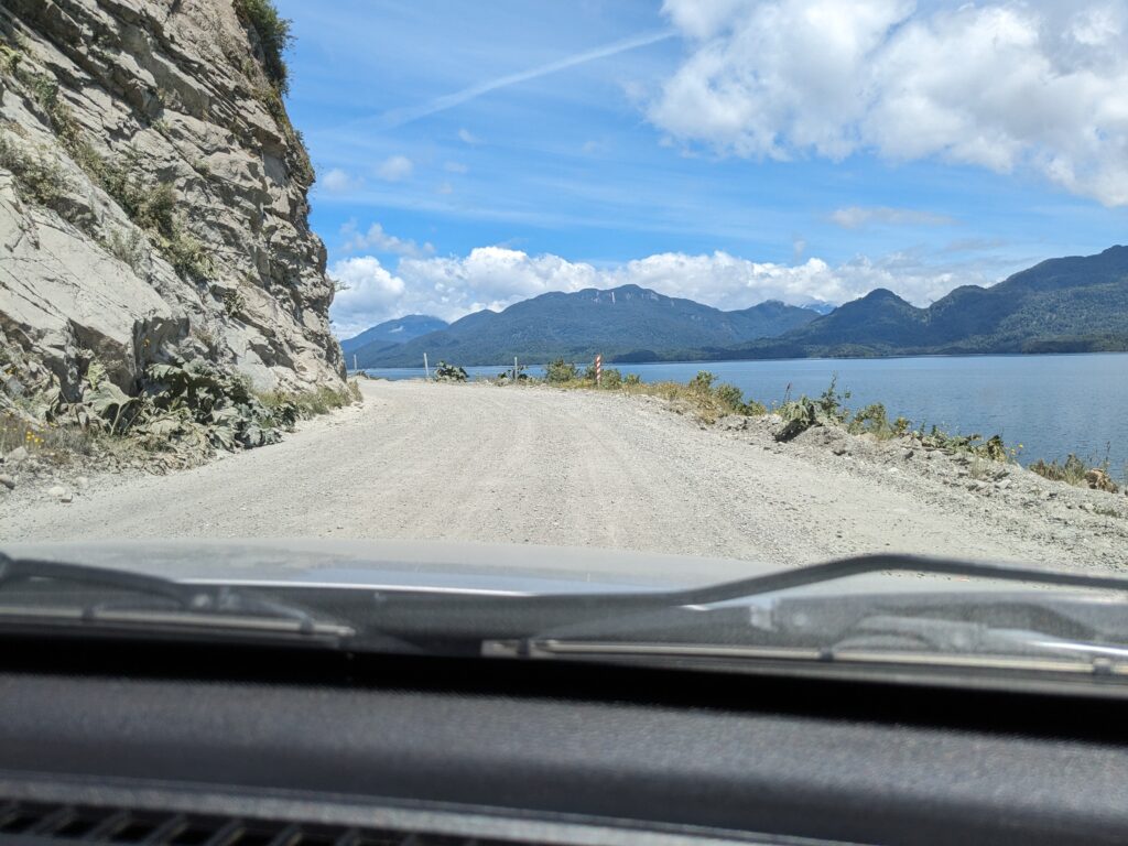 Il est 11h30. On se pose enfin, pneu réparé. Bon… on fait quoi du coup ? Après une rapide prise de décision d’à peine 1 h, nous partons pour le parc Quelat ! On prend la voiture avec notre pneu tout neuf, on roule 15 min, et d’un coup, retour du ripio…. noooooooooooooon ! En plus c’est vraiment pas un bon ripio, il vibre beaucoup et a pas mal de trous… Heureusement ça ne dure que 15 (longues) minutes avant le retour du goudron.