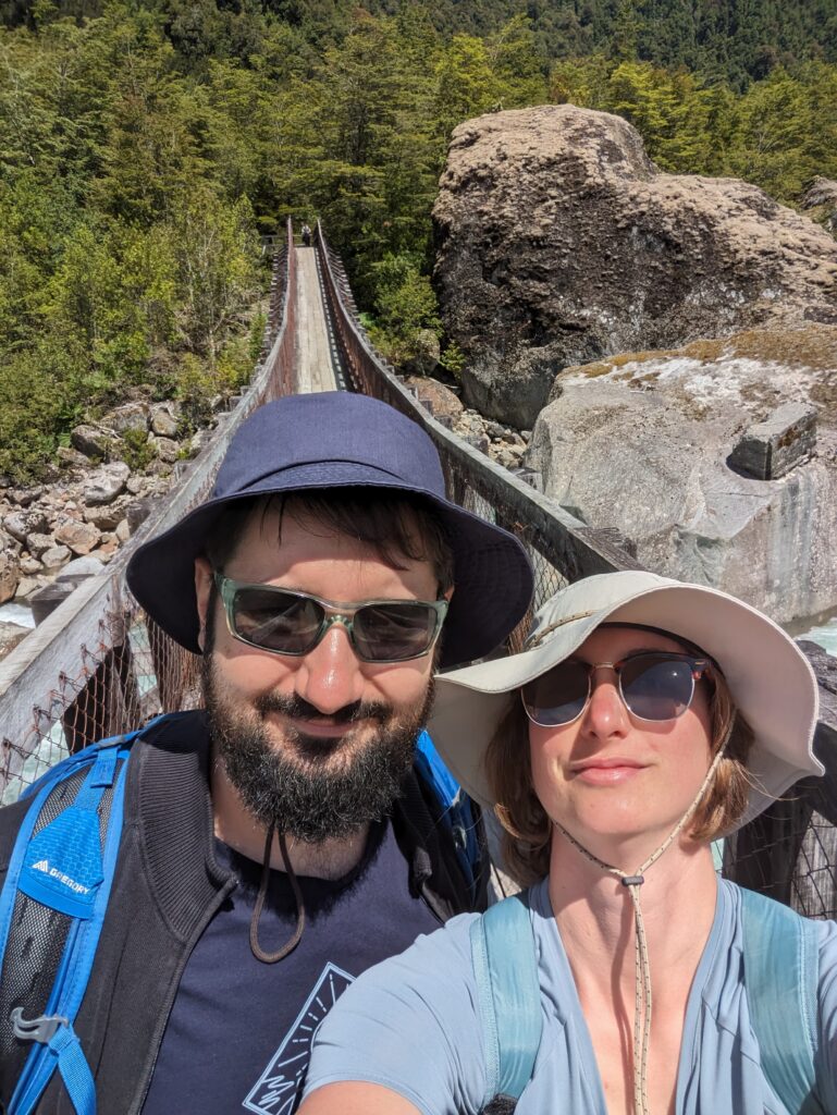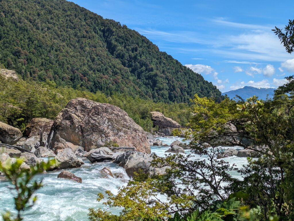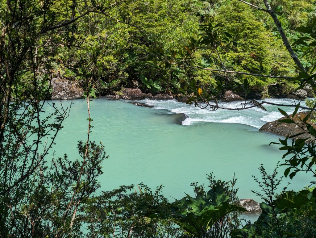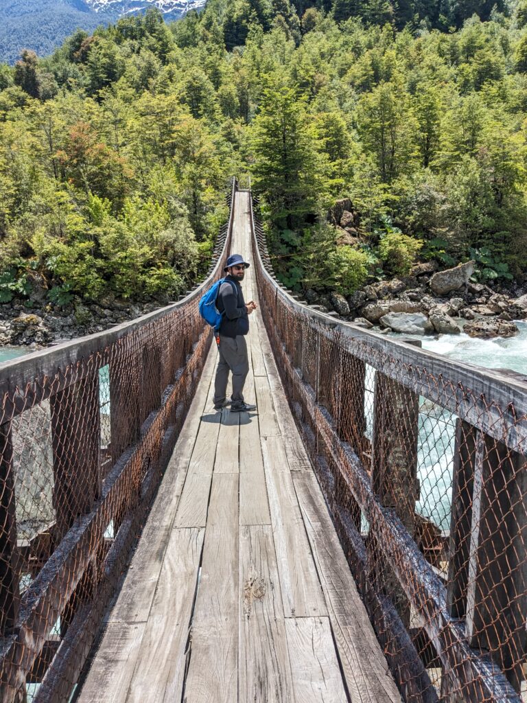 On commence la balade par traverser un pont suspendu, 4 personnes max autorisées, au-dessus d’une rivière particulièrement violente, mais d’une couleur encore une fois superbe !