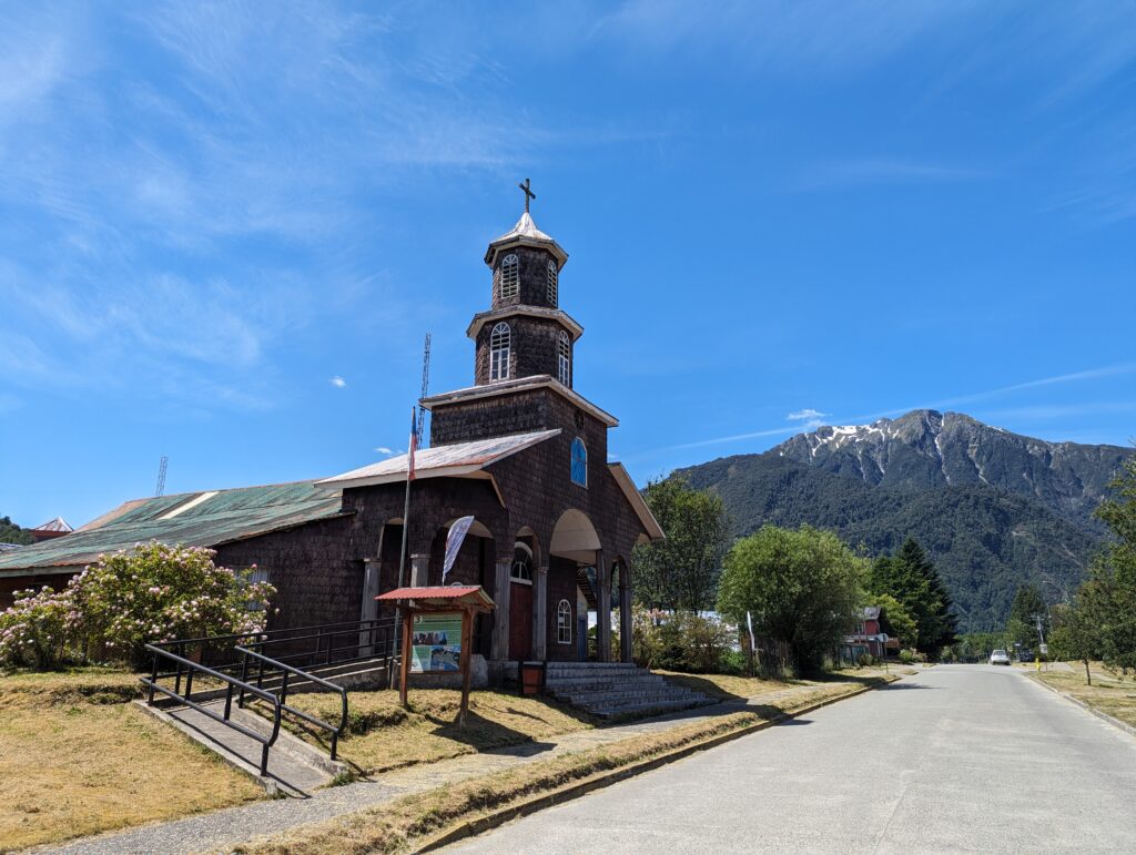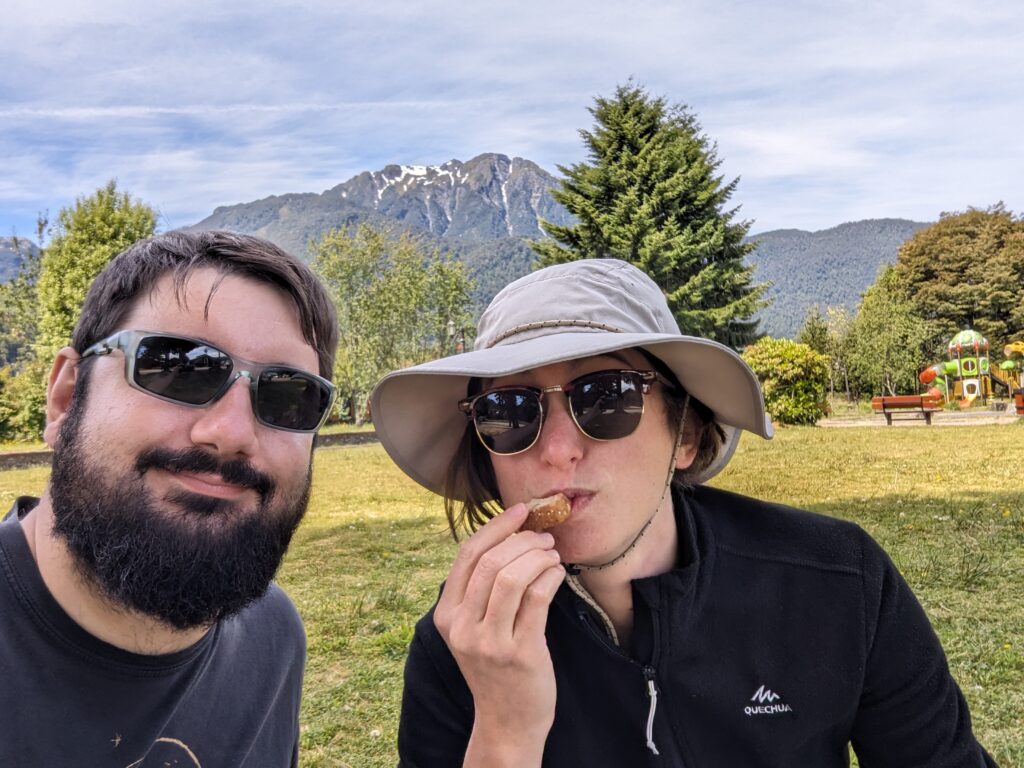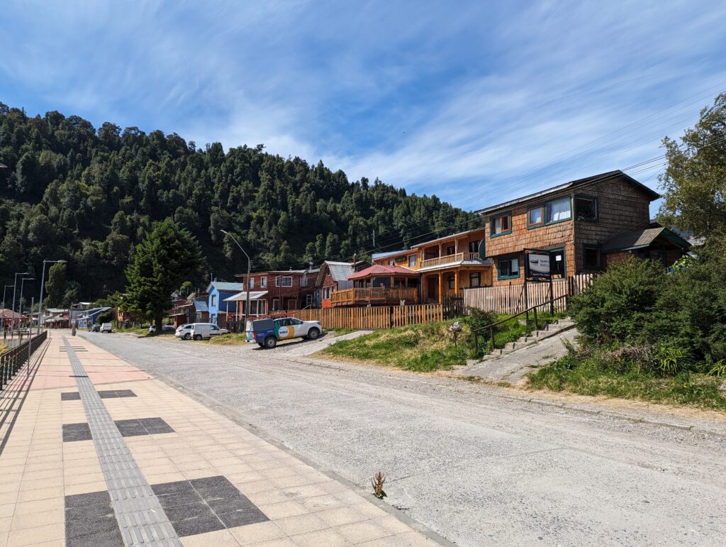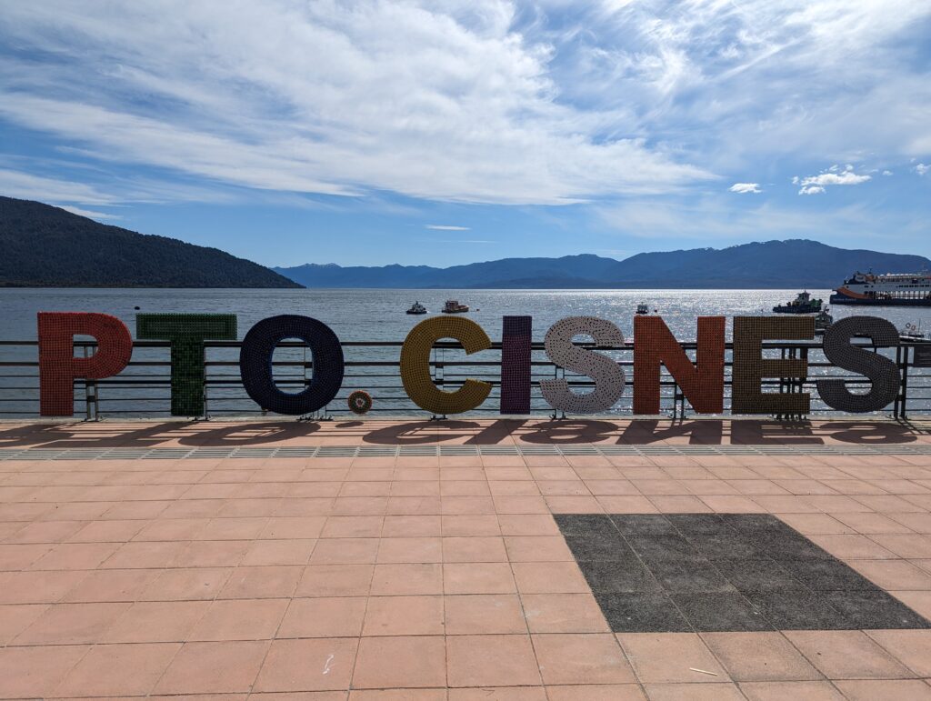On sort finalement et on retourne sur le goudron. Je suis quand même bien crevé, et inquiet pour le pneu (ça va prendre du temps je vous dis !). Mais on part faire une étape à Puerto Cisnes (a.k.a. Cheesenan). Le routard indiquait un port tranquille, et il avait raison ! C’est une petite ville très calme, et on s’y détend pendant le pique-nique dans le parc de la ville.