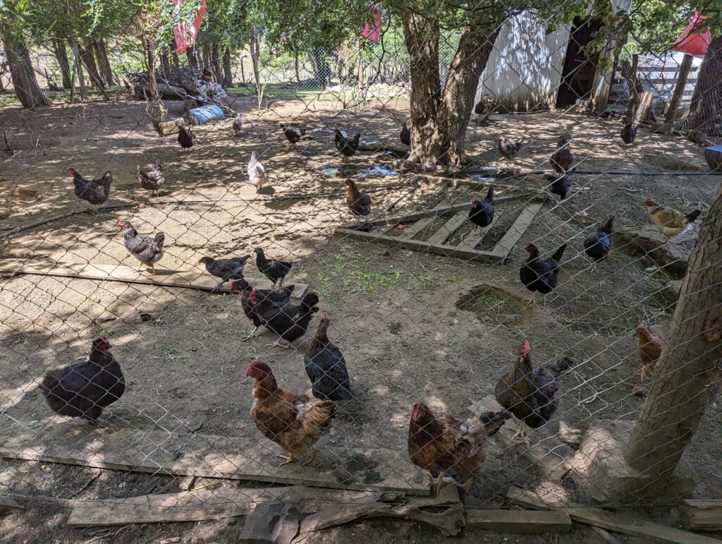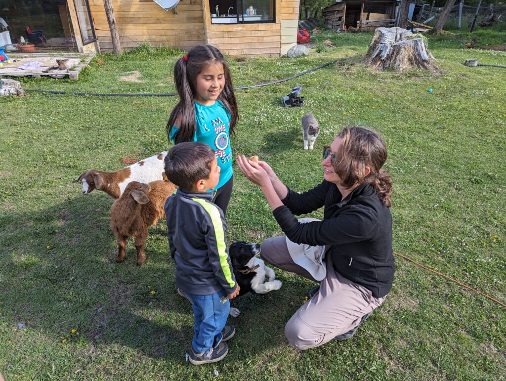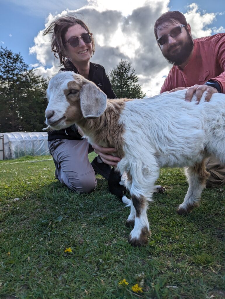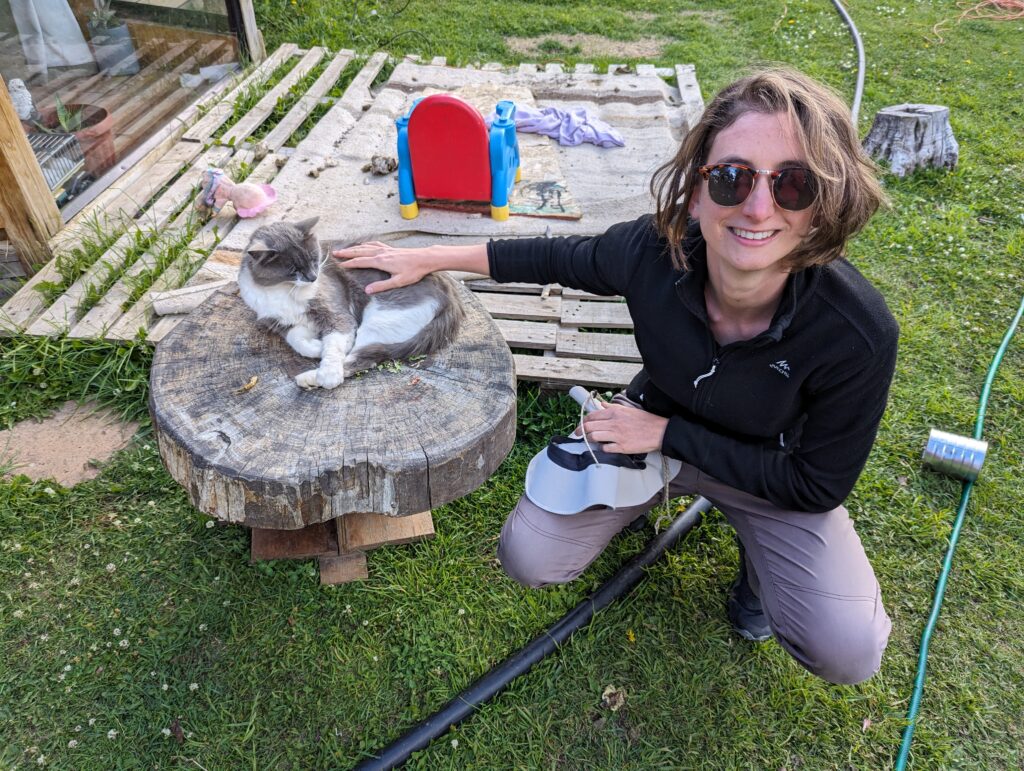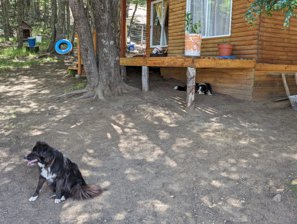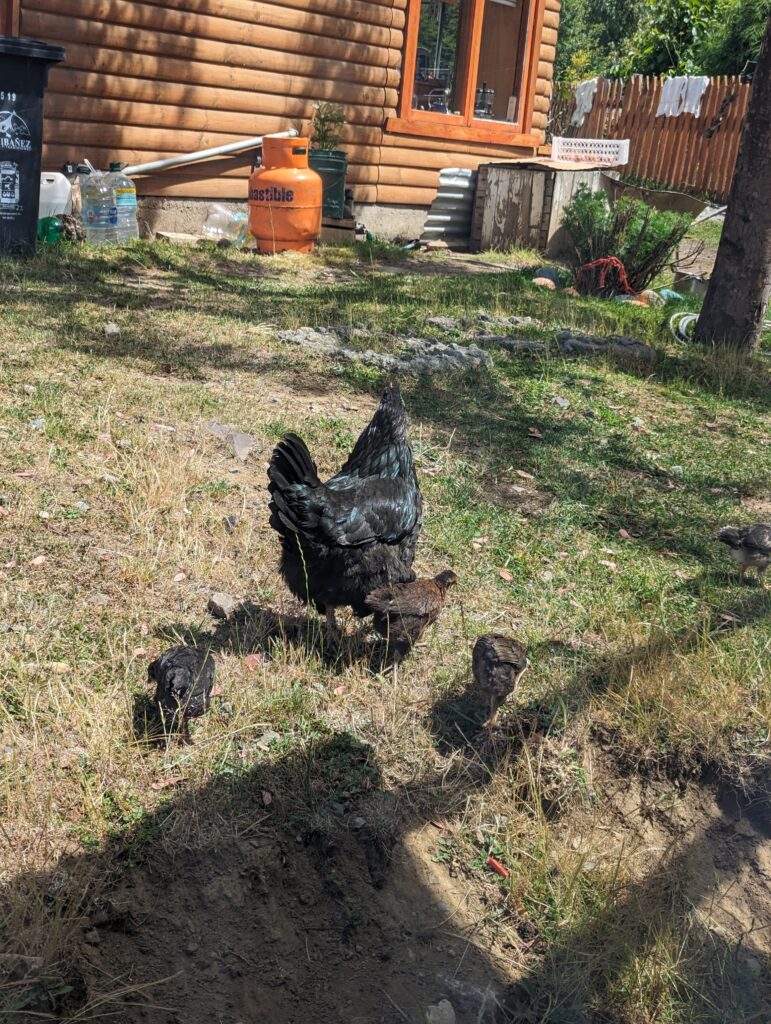Elle nous a apporté un peu de pain maison, et nous montre son jardin. Elle a installé une serre pour la première année, et elle semble fonctionner à merveille ! Elle nous indique ensuite où aller voir les animaux. On y va accompagnés de notre garde du corps : Loulou (ou Lulu ?). C’est une des deux chiennes de la famille. Elle est adorable, ADORE les câlins, par contre elle aime tellement ça qu’elle attaque l’autre chienne (plus agée) dès que cette dernière reçoit de l’attention…