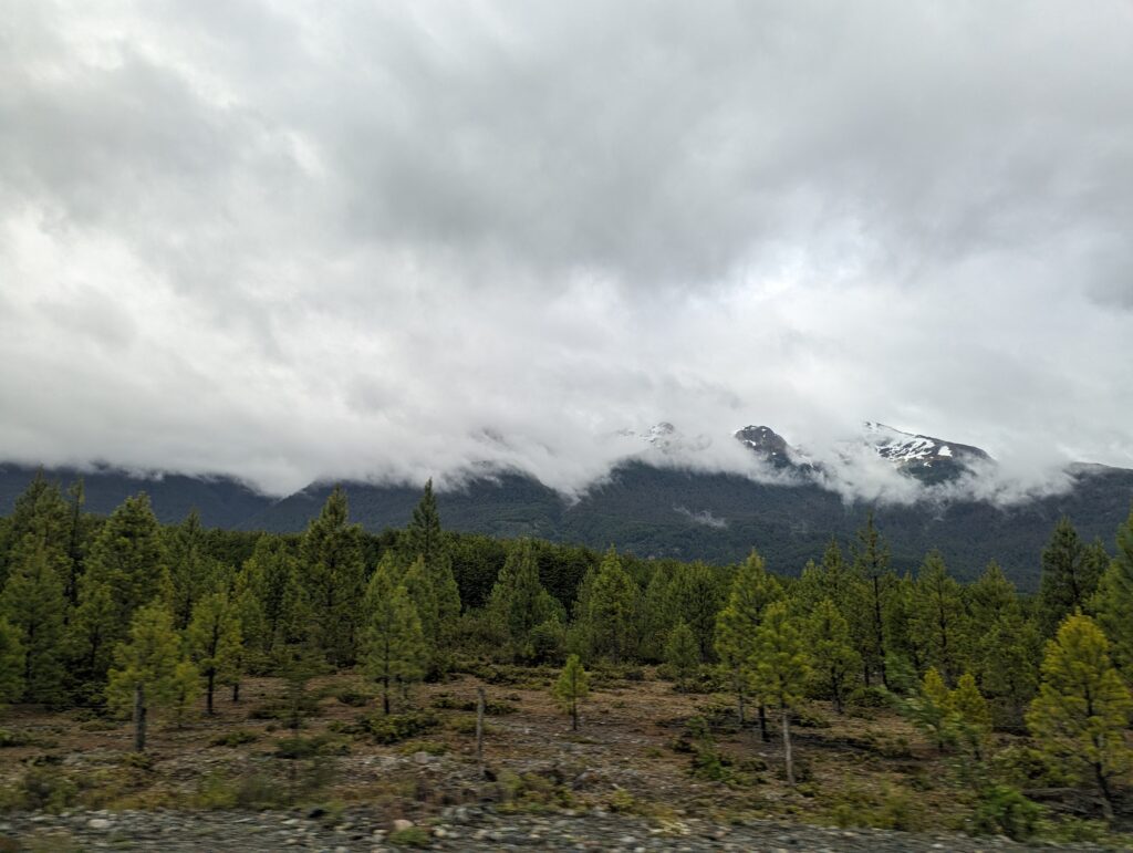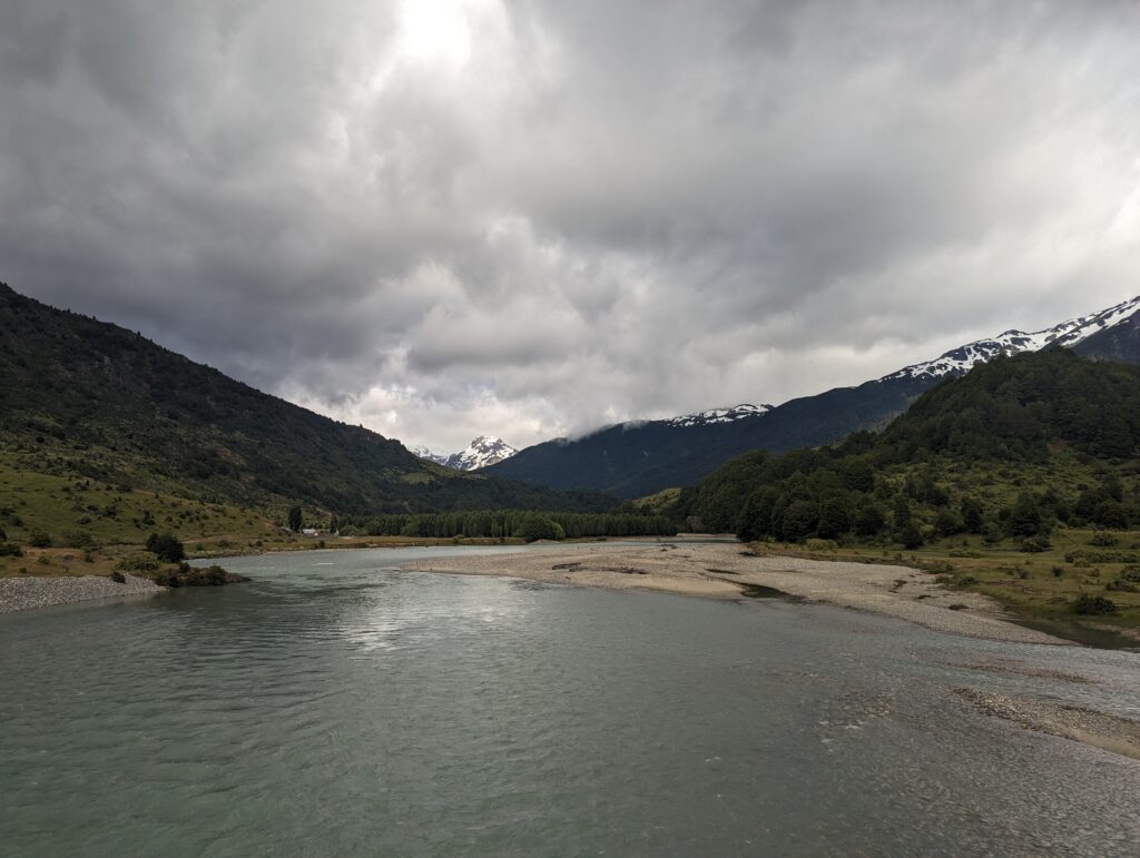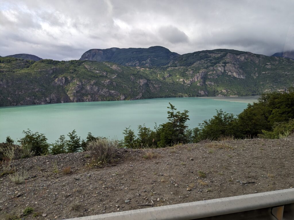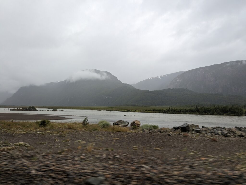 Bon, sinon à part l’état de la route, la première partie du trajet le long du Rio Ibanez est vraiment belle. Un volcan a explosé il y a plusieurs années inondant le secteur et tuant la végétation, qui reprend peu à peu ses droits. On se retrouve donc avec des forêts d’arbres très jeunes c’est assez étrange. Le reste de la route est assez quelconque, le temps n’aidant pas….