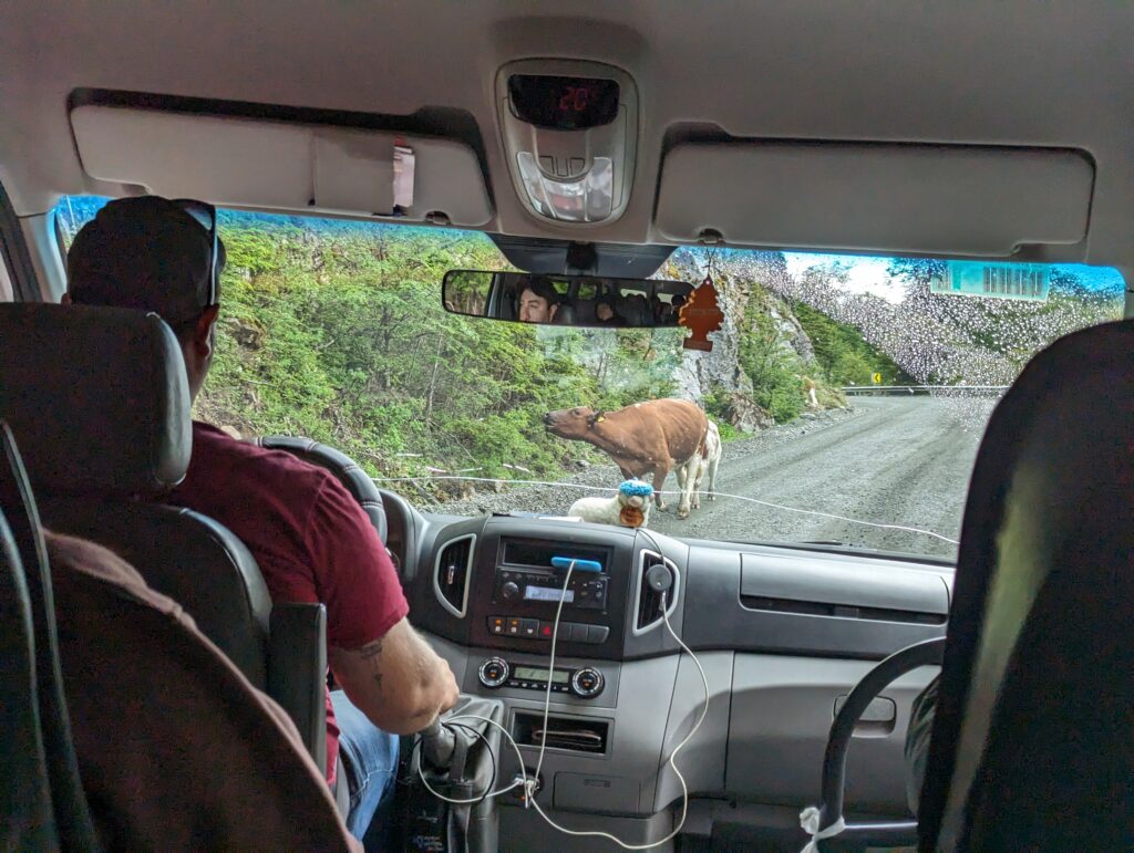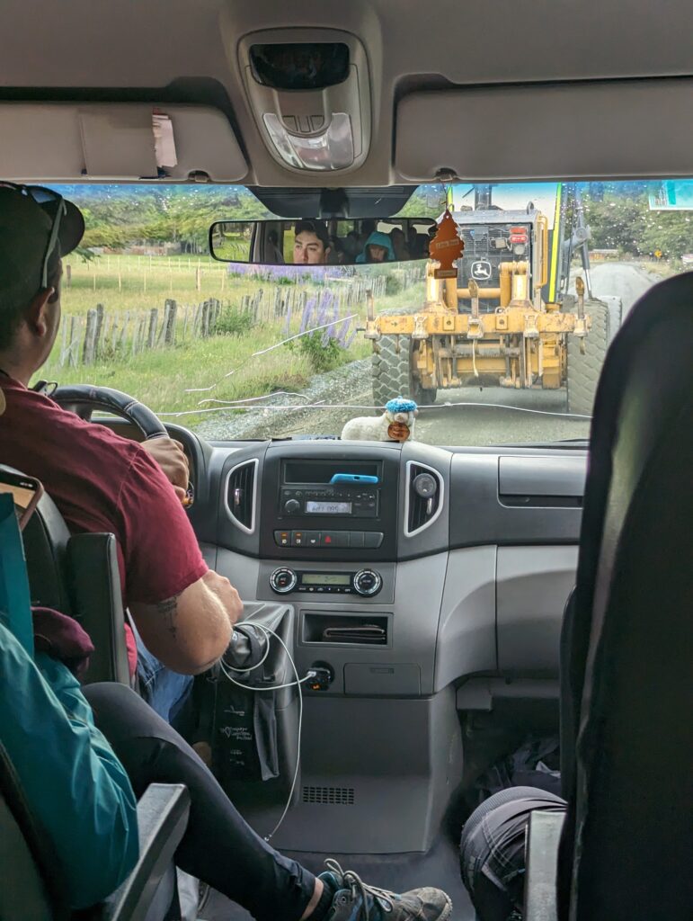 Avec Elena, on attend un seul truc, voir si le ripio est aussi terrible que le laissait sous-entendre la fille d’hier, et surtout voir comment notre chauffeur va se débrouiller sur le ripio avec son minibus… On y arrive, c’est parti. ça tremble un peu, mais pas tant que ça. Lui aussi roule sur le bord de la route quand le centre vibre trop, et esquive les gros trous (on note, on note). Et là Elena me demande si je vois la vitesse. 70km/h !!!
