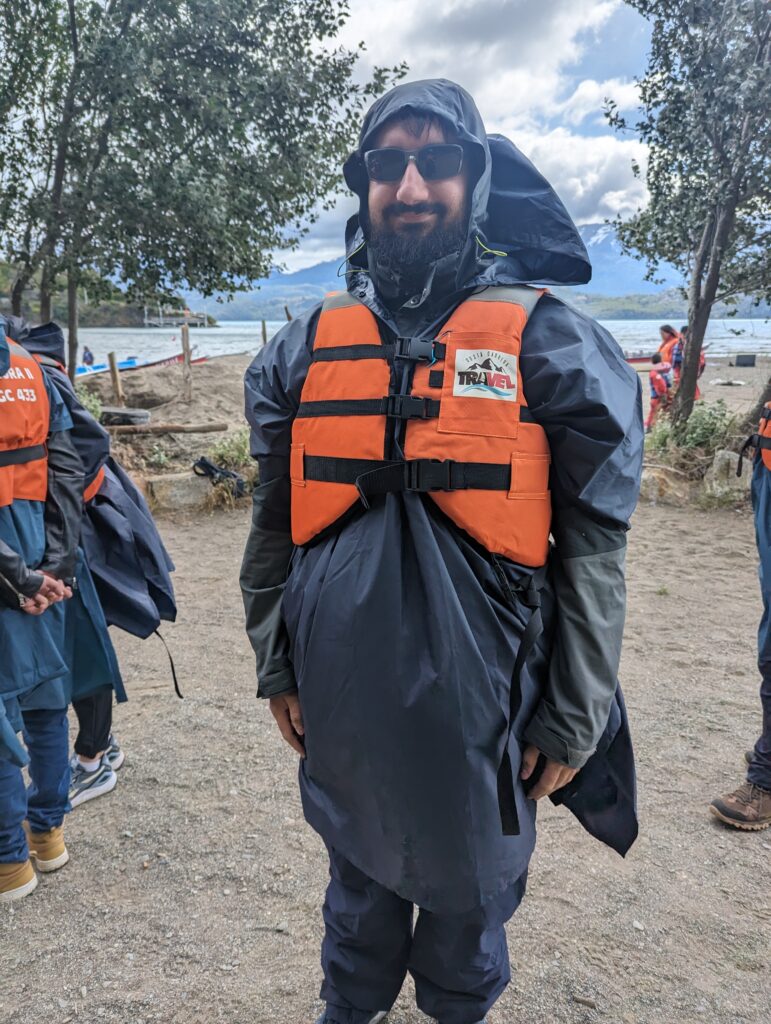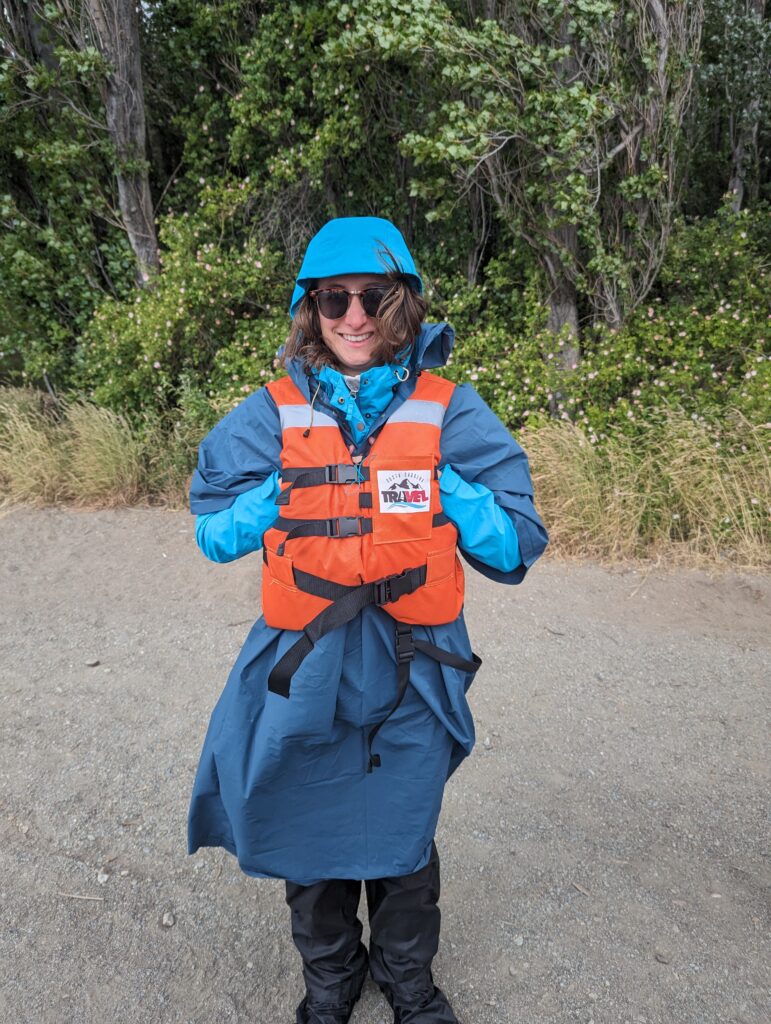 On arrive enfin au lago General Carrera, puis à Puerto Rio Tranquilo. Petite pause toilette payante avant d’embarquer. On nous avait dit de prendre des vêtements imperméables. Donc on enfile nos vestes imperméables, nos surpantalons imperméables, et avec ça on nous rajoute un poncho imperméable et un gilet de sauvetage ! En plus, les nuages laissent place au soleil ! Avec tout ça on va pas être mouillés !