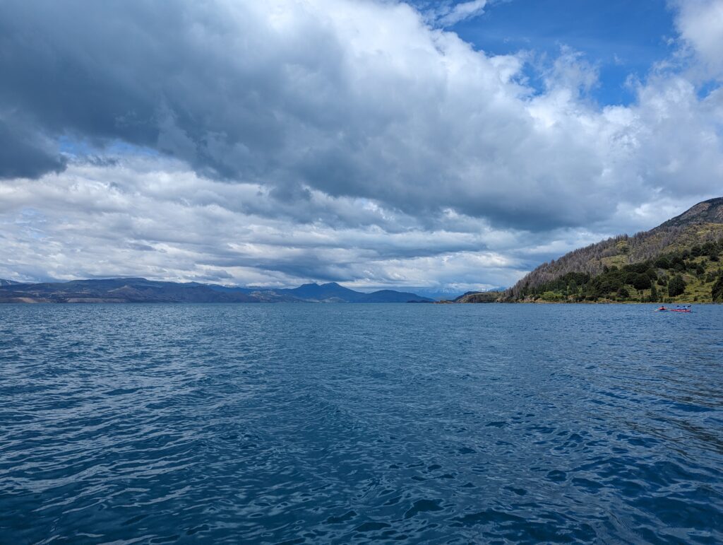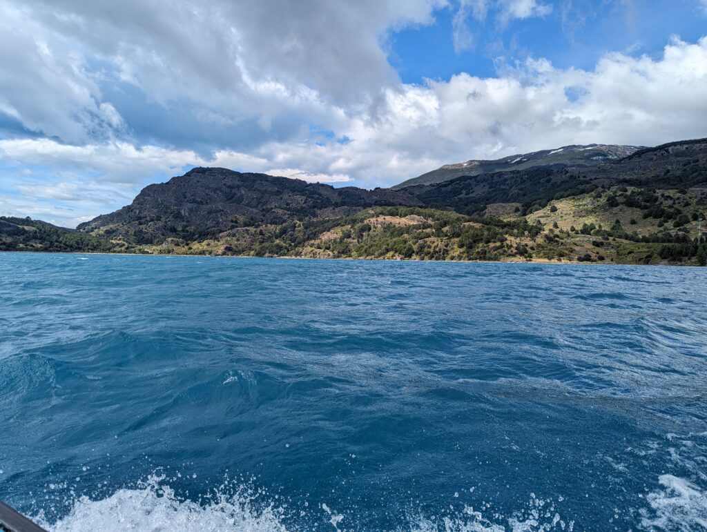 On apprend que le lac s’appelait avant le Lago Chelenko signifiant dans le dialecte local « eau tumultueuse ». Et on comprend vite pourquoi, car le bateau saute beaucoup sur les vagues ! Mais une fois de plus l’eau est superbe !