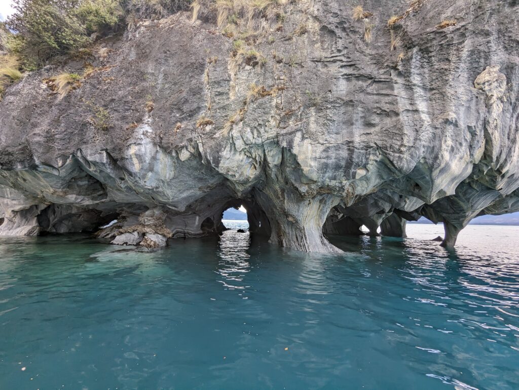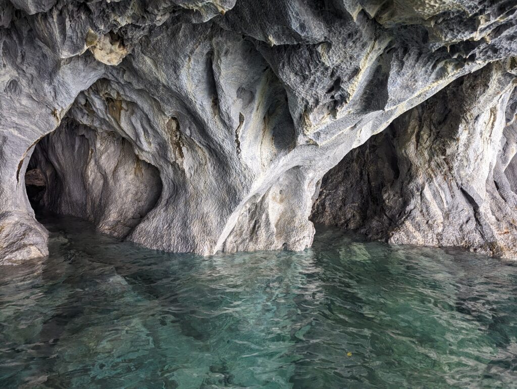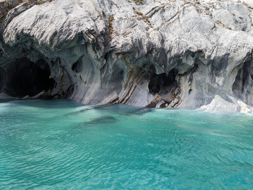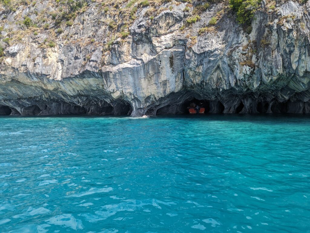 Puis on s’approche enfin des cavernes de marbres. On rentre dans la première, c’est joli mais les couleurs sont assez ternes par rapport aux photos sur internet où l’on voit le marbre s’éclairer de bleu, violet, vert. Pourtant on a le soleil. Bon ça doit être la suite qui est encore plus belle ! L’eau par contre reste incroyable.
