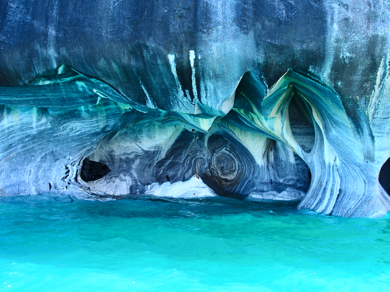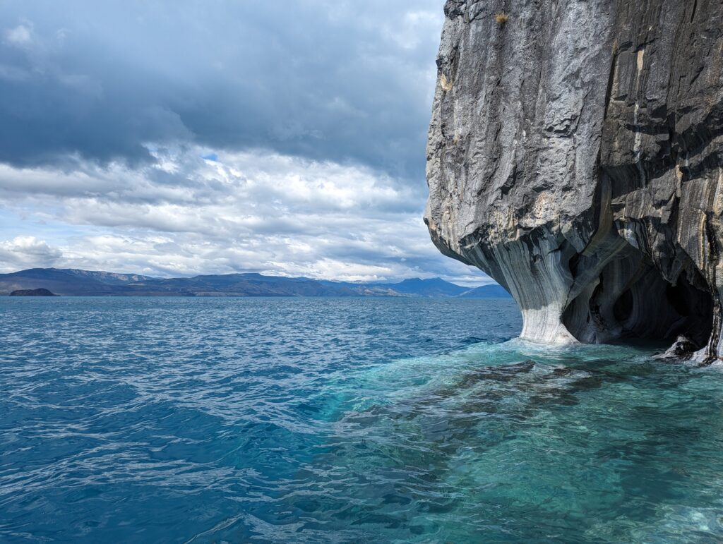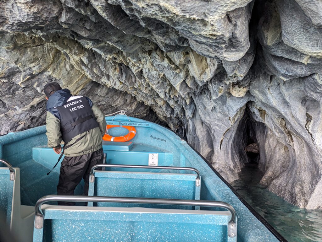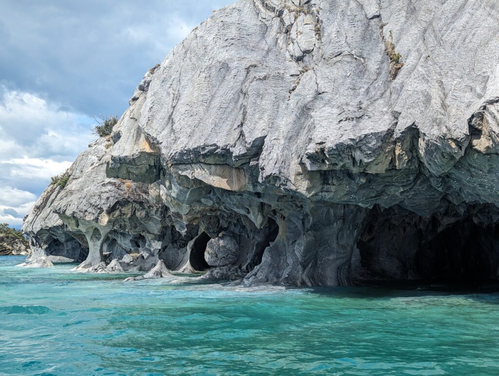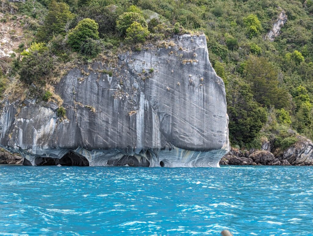 Puis on s’approche enfin des cavernes de marbres. On rentre dans la première, c’est joli mais les couleurs sont assez ternes par rapport aux photos sur internet où l’on voit le marbre s’éclairer de bleu, violet, vert. Pourtant on a le soleil. Bon ça doit être la suite qui est encore plus belle ! L’eau par contre reste incroyable.
