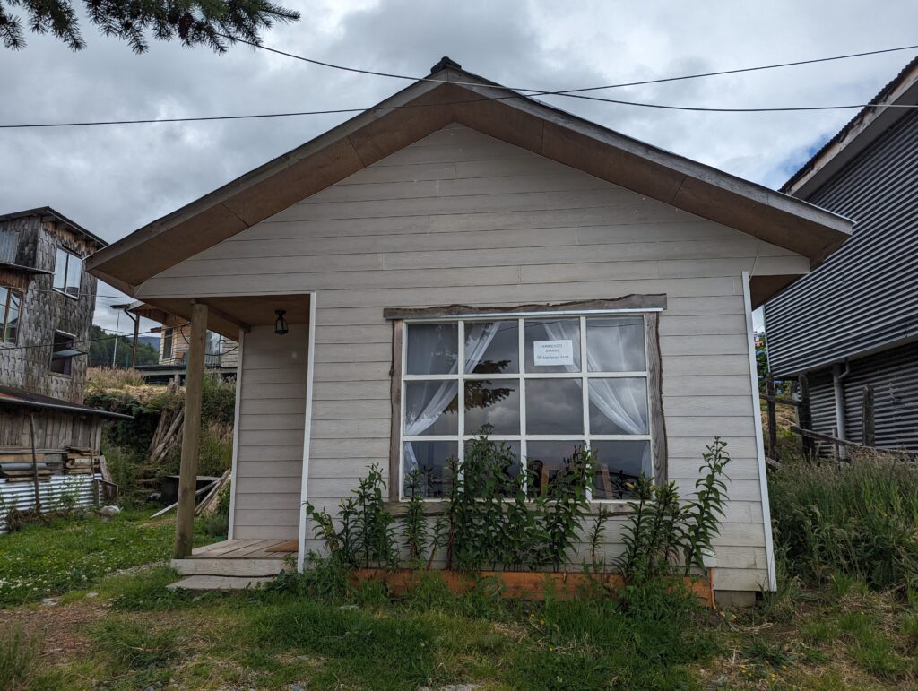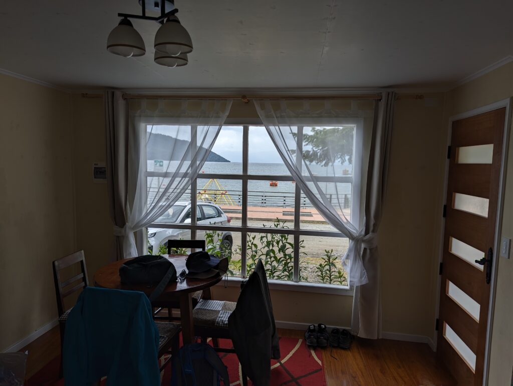 On arrive à Puerto Cisnes, et notre cabana ce coup ci est bien mieux, on a frigo, table, chaise, et… vue sur la mer !