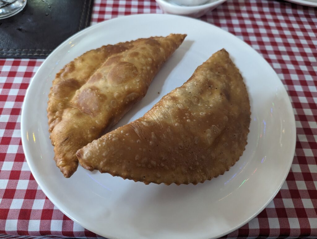 On crève de faim, car il est 16 h, on cherche un restau : deux possibilités. On en choisit un car il a l’air d’avoir plus de choix, et j’avais envie de poisson. On arrive devant, l’ardoise dehors indique un menu très apetissant. On s’installe, on attend 20 min sans menu, je vais le chercher pour commencer à choisir. Le serveur (très gentil) arrive peu après : « par contre il ne nous reste que des empanadas, du beefsteak, ou une soupe de poulet ». Ah… bon, une soupe et des empanadas. Il revient : « en fait on a plus de soupe… » On hésite, mais on a faim, ce sera donc empanadas (bonnes mais sans plus), 45min d’attente après la commande, et un resto raté !