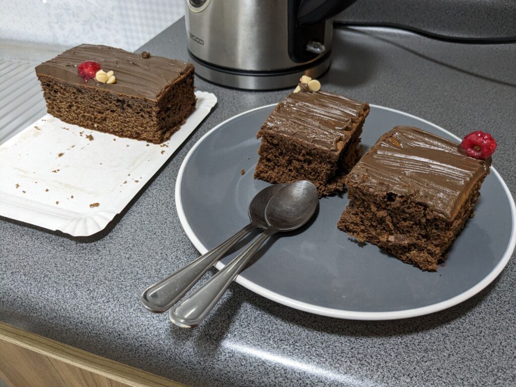 Au retour, on passe acheter du pain, la boulangerie vend aussi un gâteau qui nous semble fort apetissant, on prend une part, elle nous donne la plus grosse comme ça c’est plus simple à partager!!
