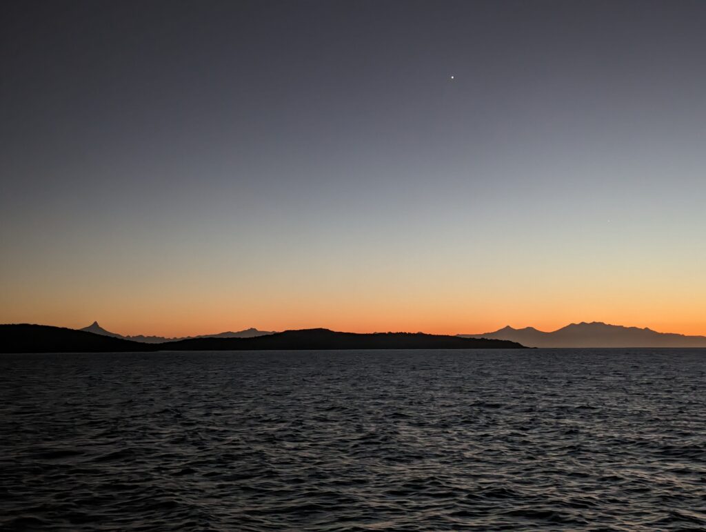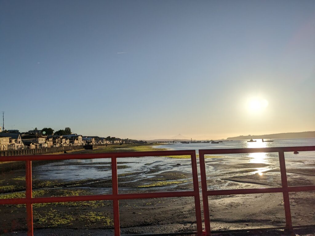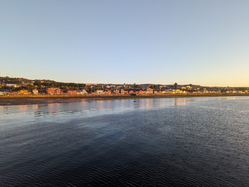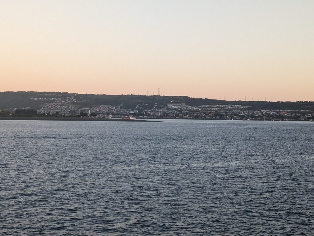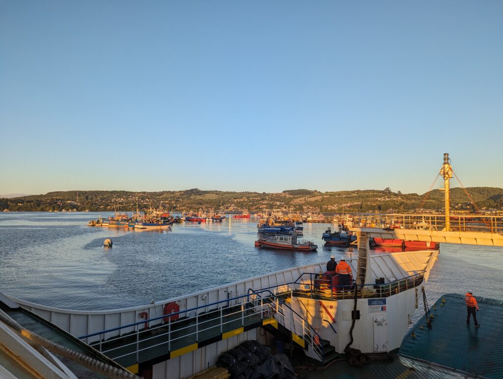 Vers 5h30, on se réveil même si on n’a pas super bien dormi car tout le monde s’agite autour de nous. On arrive bientôt ! Ah non, on arrive qu’a 7h en fait. ça empêche pas tout le monde de se lever, parler, et même chanter pour notre voisine… On n’a donc pas beaucoup de sommeil en arrivant à Quellon, au sud de l’île de Chiloé.