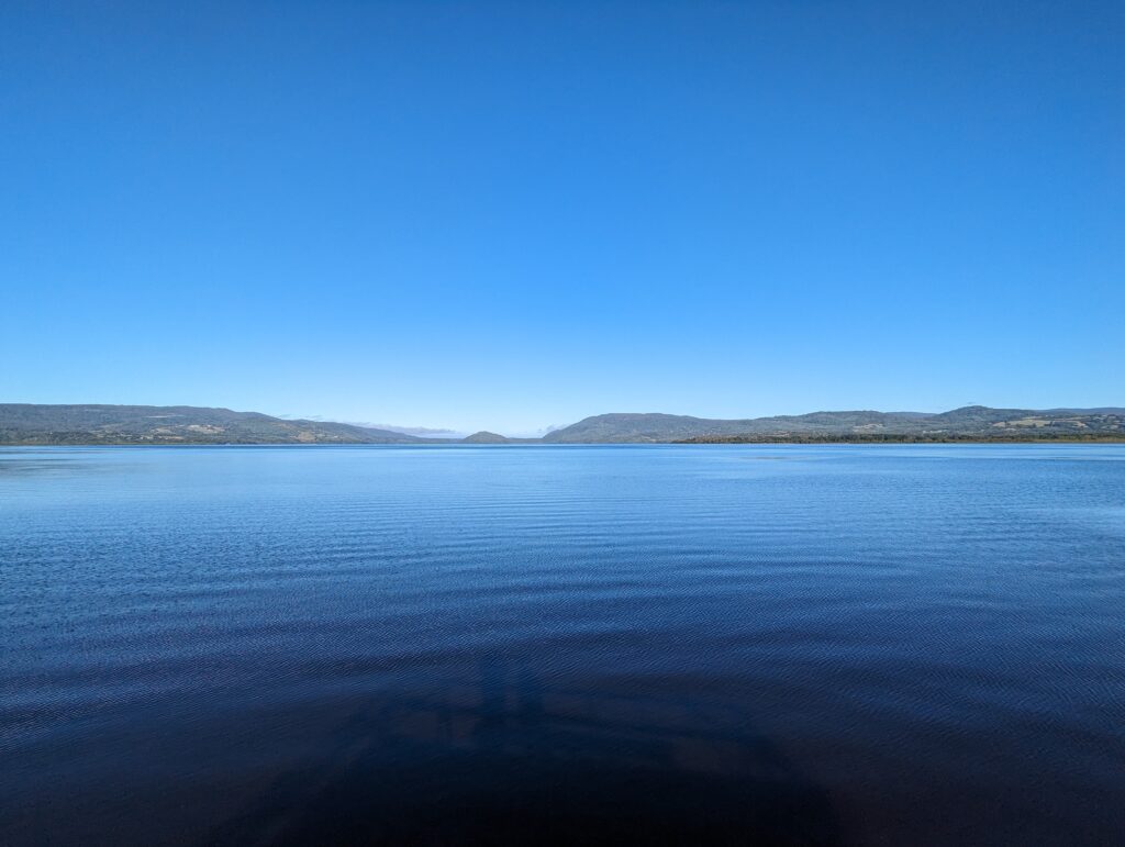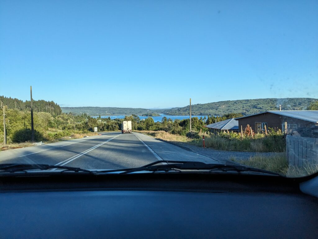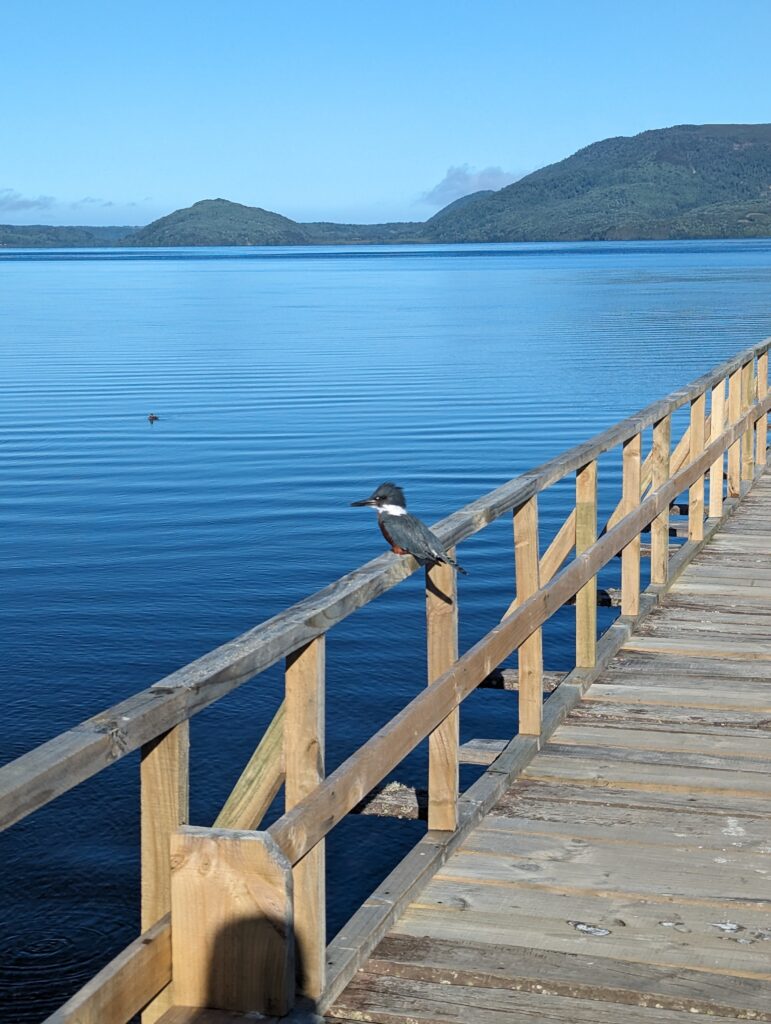 Après une petite heure, on sort de la Ruta 5 en direction de Cucao, et là merci la route est parfaite ! On s’arrête à Huilinco, un petit village au bord d’un grand lac du même nom. L’endroit est vraiment relaxant. On monte sur le ponton qui s’avance sur le lac. Sur notre gauche, une mini-cascade pour amener le doux bruit de l’eau qui s’écoule à nos oreilles. Et devant nous un martin-pêcheur ! On s’approche, il va plus loin. On s’approche encore, il va encore plus loin, on continue la danse 3 fois avant qu’il s’en aille et qu’on atteigne le bout du ponton.