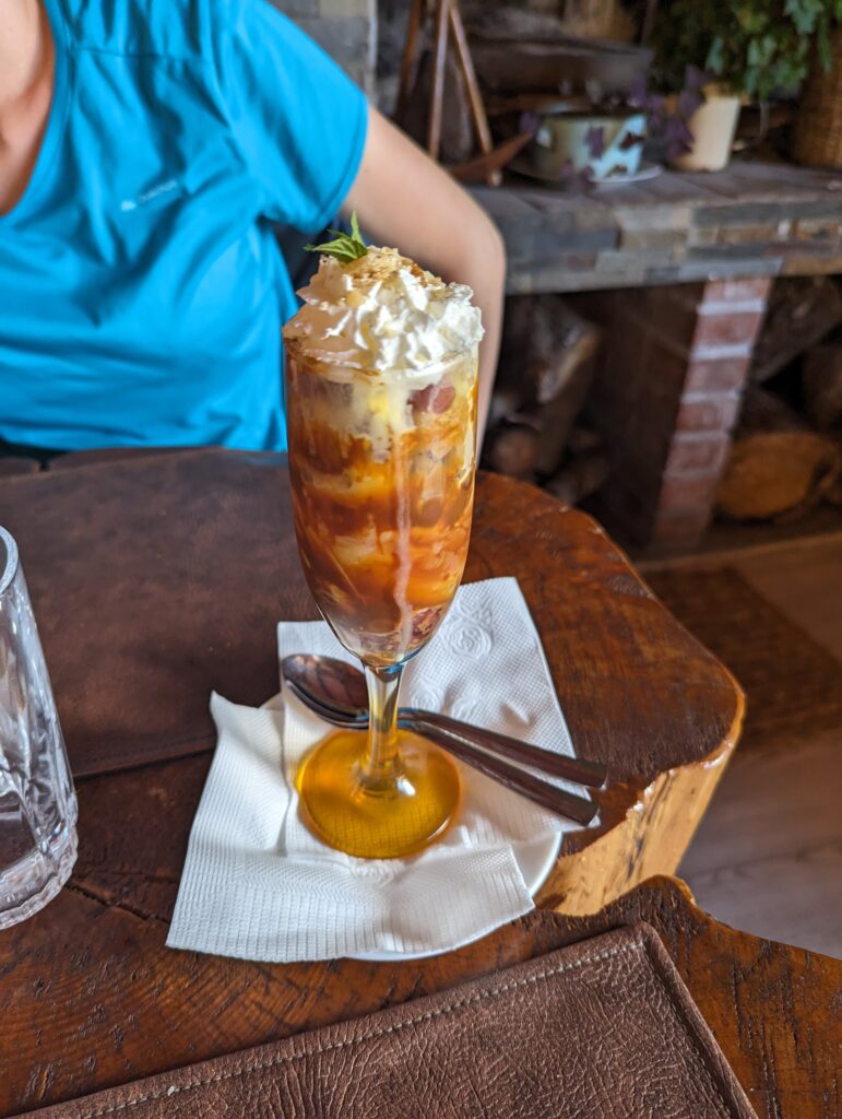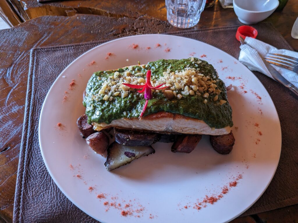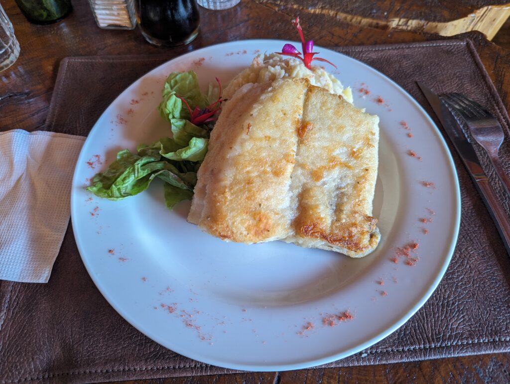 Petite sieste en arrivant car on est vraiment crevés, puis il est temps d’aller manger. On trouve un resto super bon à 10 min à pied ! Je prends merlu frit avec une purée de patate au fromage et oignons frits qui a un arrière-gout d’aligot. Et Elena un saumon spécial avec une sauce épinards et pommes de terre (dont l’origine est de Chiloé !). Enfin en dessert, une coupe de glace avec caramel et des baies d’arracyuan, arbre typique de l’île !