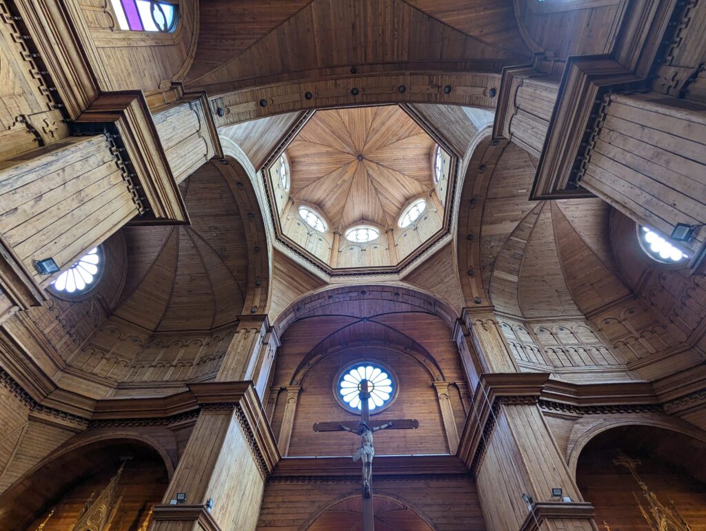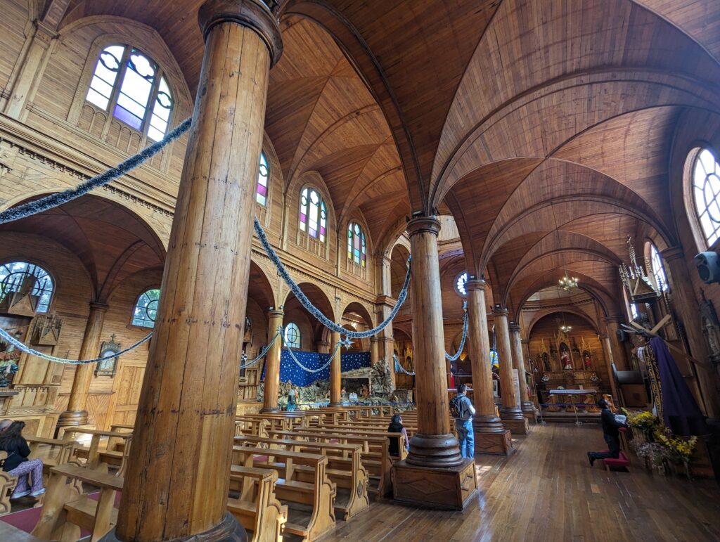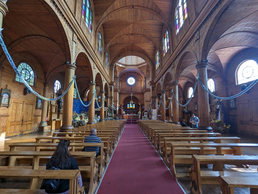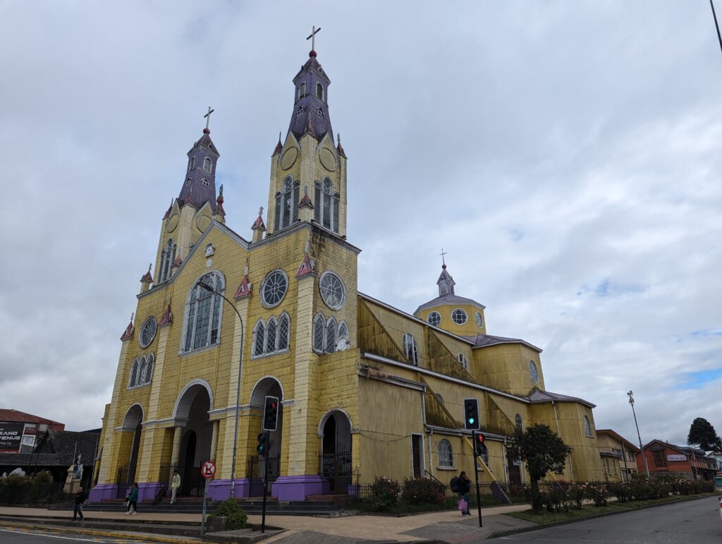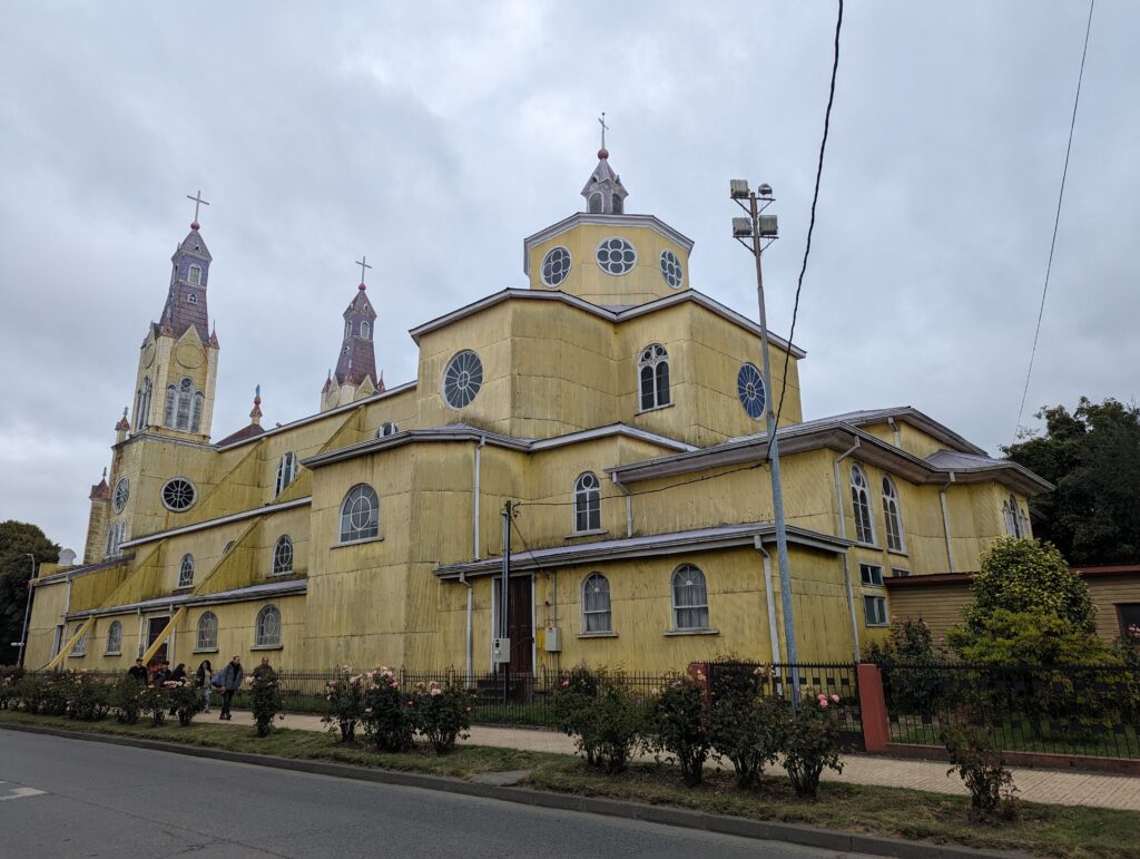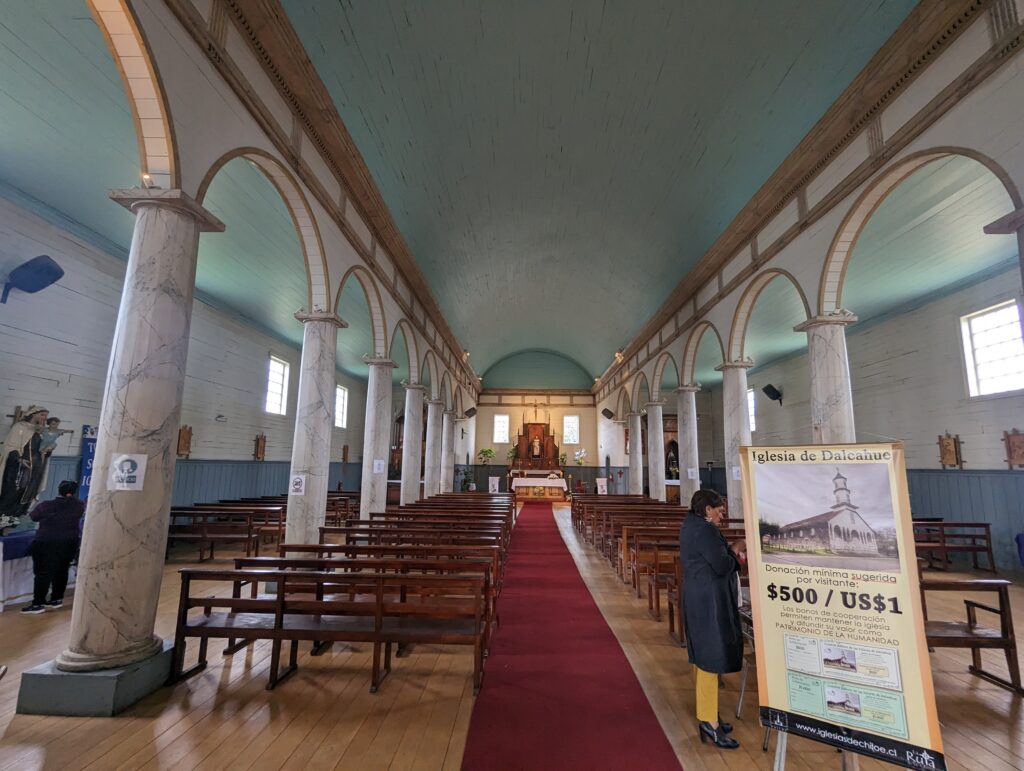 On repart enfin, et on roule quelques minutes pour Dalcahue, une petite ville au nord-est. Premier arrêt, on en a l’habitude, église ! C’est la plus belle de l’île selon le routard, on a beaucoup d’attente, et… ben pas pour moi. Je la trouve jolie mais j’en ai vu des plus belles ici !
