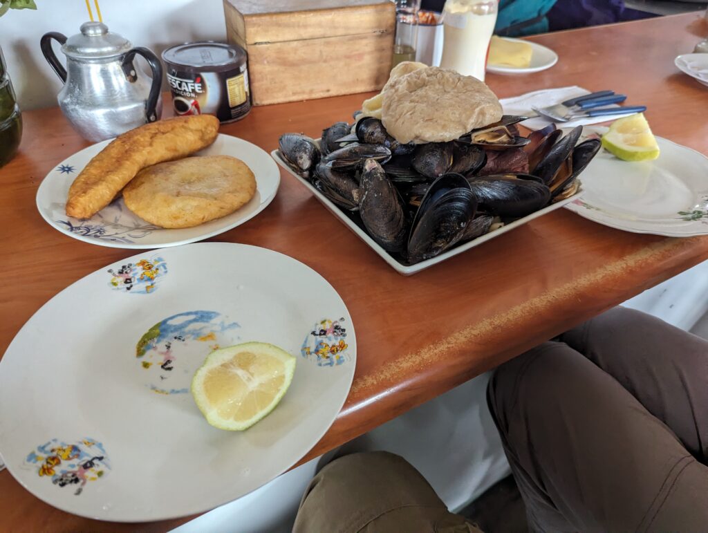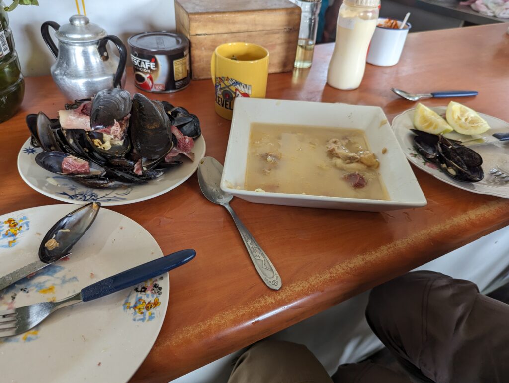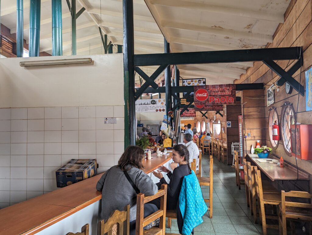 Bon, c’est bien beau tout ça, mais on a faim ! On rentre donc enfin dans la Cocineria. Et là, petite déception de notre part. On s’attendait à avoir plein de petits restaurants qui proposent chacun sa cuisine. Au final tout le monde vend la même chose au même prix… On en choisit un un peu au hasard, et on commande pour commencer un Curanto, un plat typique de Chiloé, et encore des Milcao, les fameuses galettes de pommes de terre frites et fourrées.