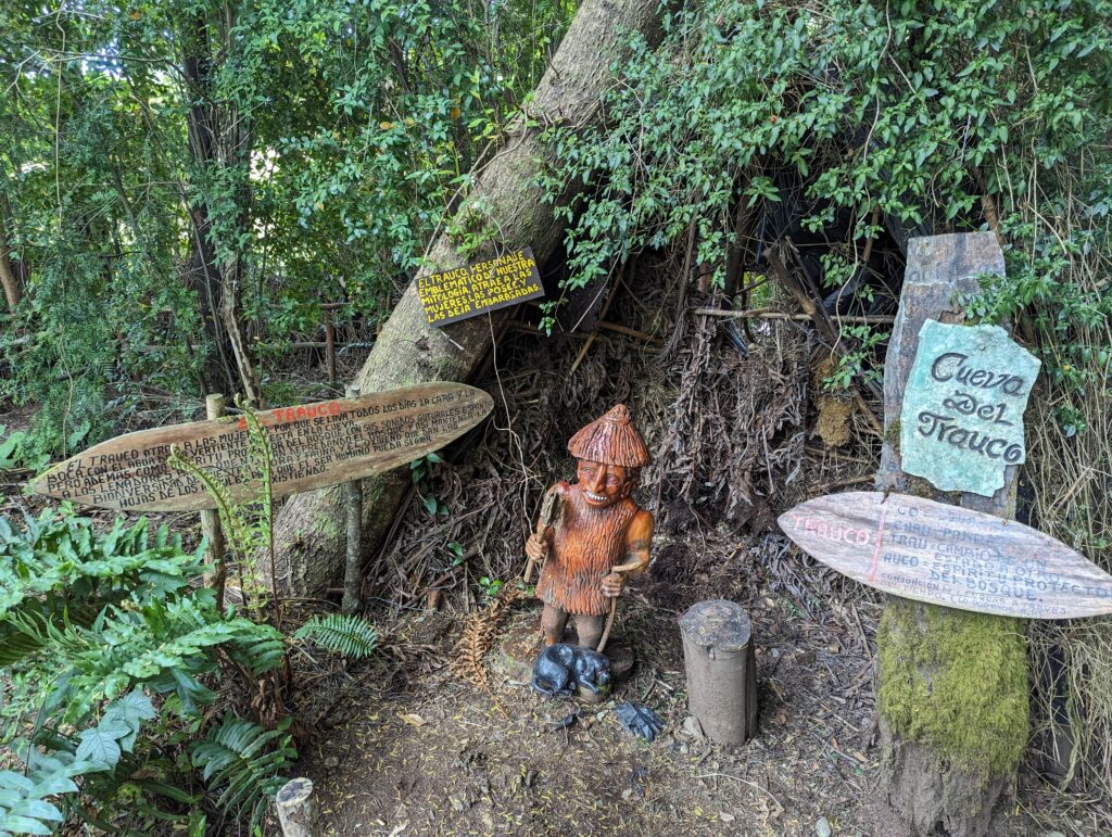Sur le chemin, on s’arrête au Parque Ecológico y Mitológico. Une sorte de musée dans le jardin d’une propriété privée qui parle des monstres et légendes locales. On part sans comprendre qu’il y a un tour guidé, heureusement une petite fille vient nous voir pour discuter. On a du mal a comprendre, mais on comprend qu’elle attend sa mère qui traîne derrière. Mère qui n’est d’autre que la guide de la visite ! Bon au final elle se contente principalement de lire les pancartes, mais bon ça entraîné notre compréhension orale (et la compétence de traduction live d’Elena pour Adrien !)