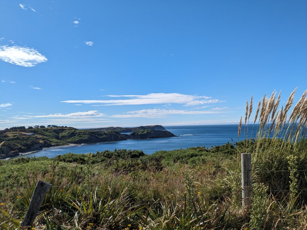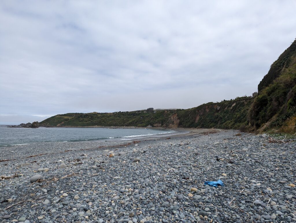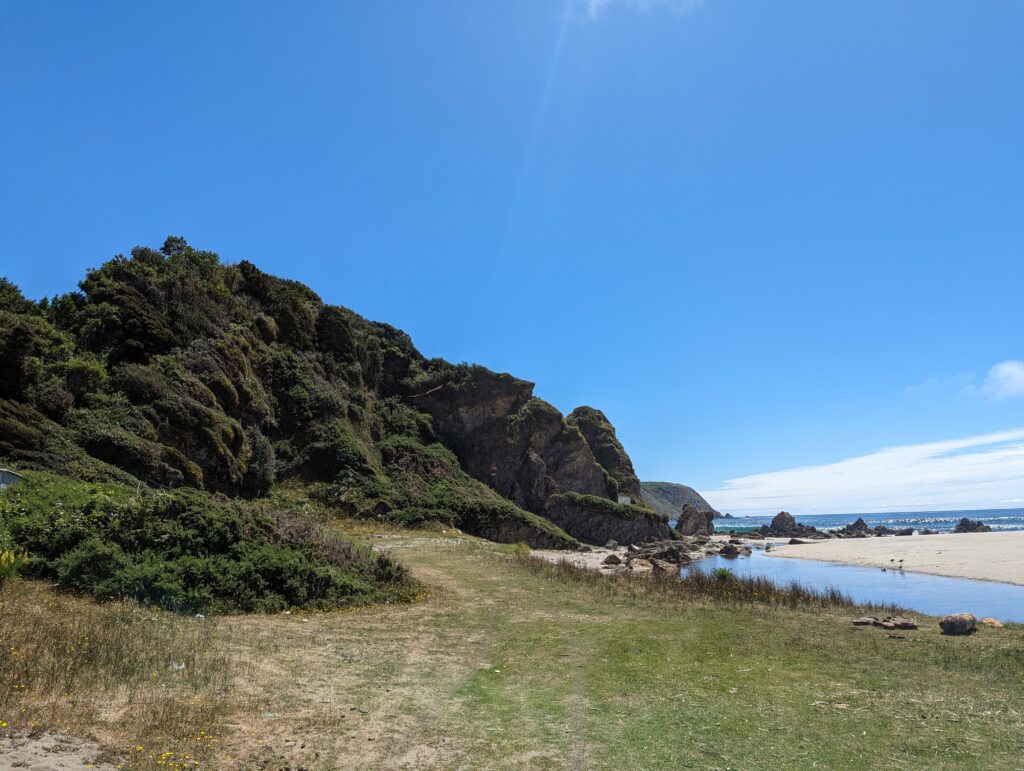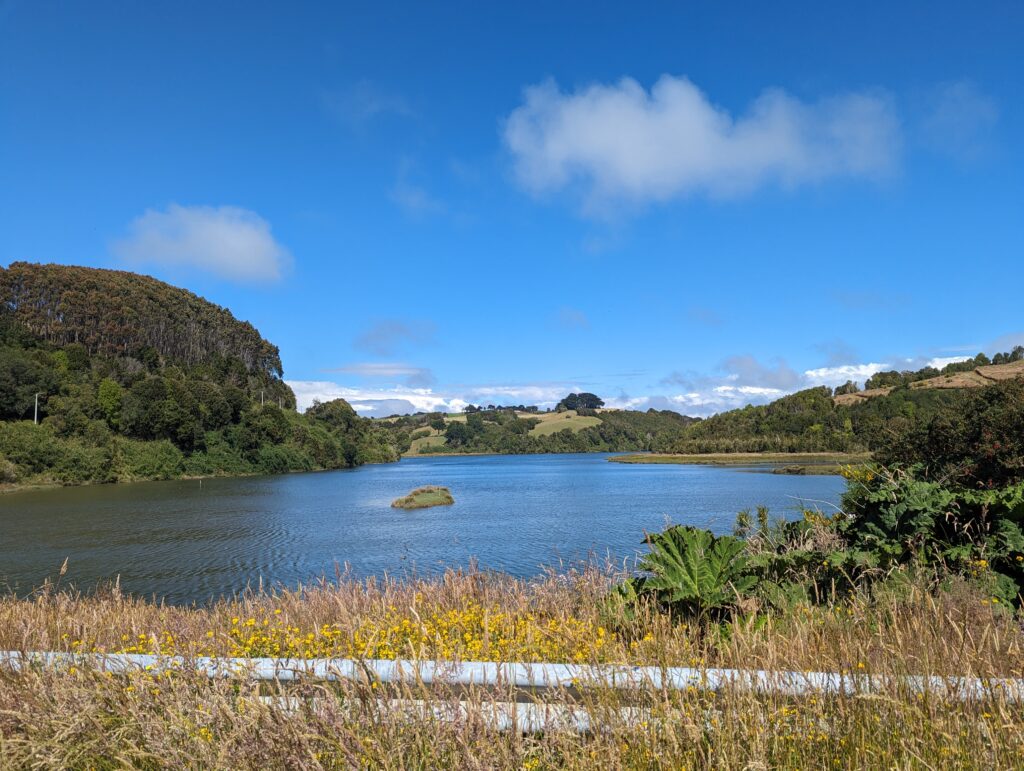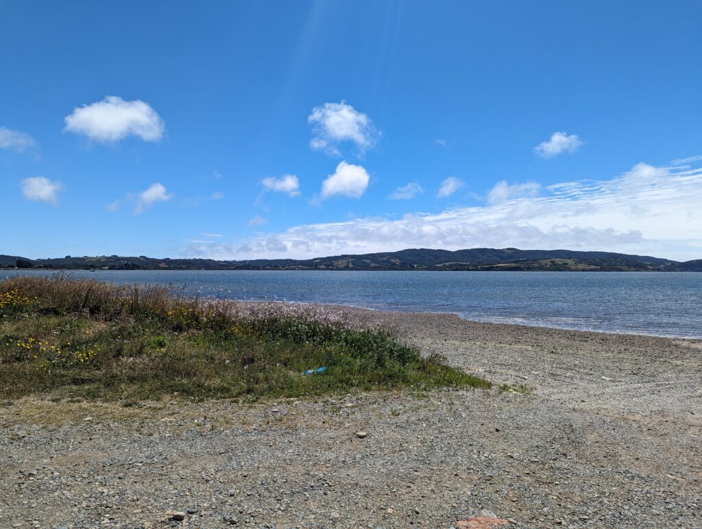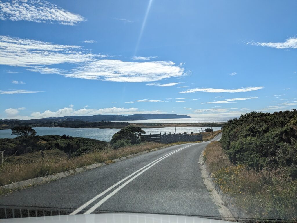 On a été très content du tour. Sur la fin, le guide nous parle d’une plage magnifique où l’eau est bleue azuré. On s’y dirige donc pour pic niquer. La route n’est pas simple, là on a du bon ripio qu’on aime. On descend une pente très raide qui donne sur… un chantier. ah bon… On remonte la voiture, on descend à pied. On va à la plage. Elle est… pas folle. Et il y a plein de vent. Petite vérification rapide… ce n’est pas la bonne plage. Il faut retourner au point de départ…