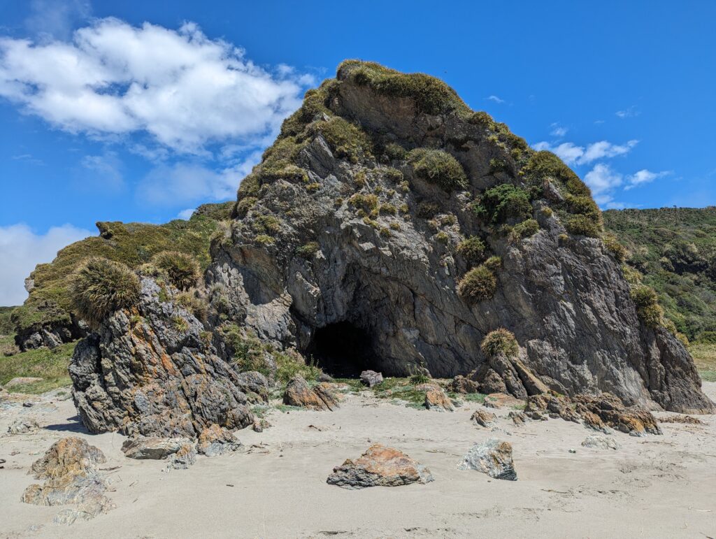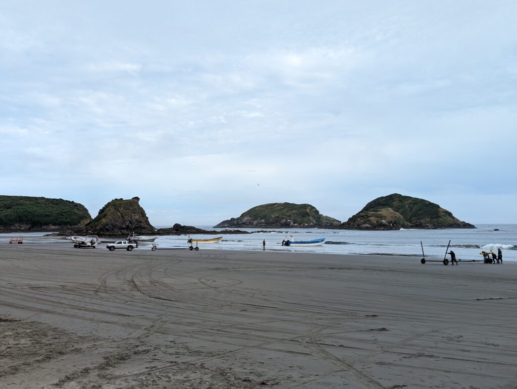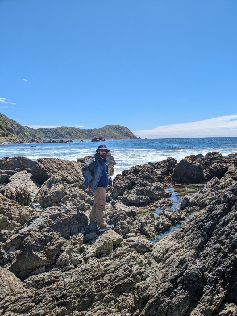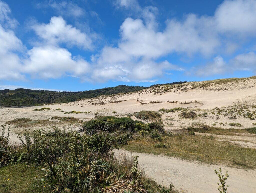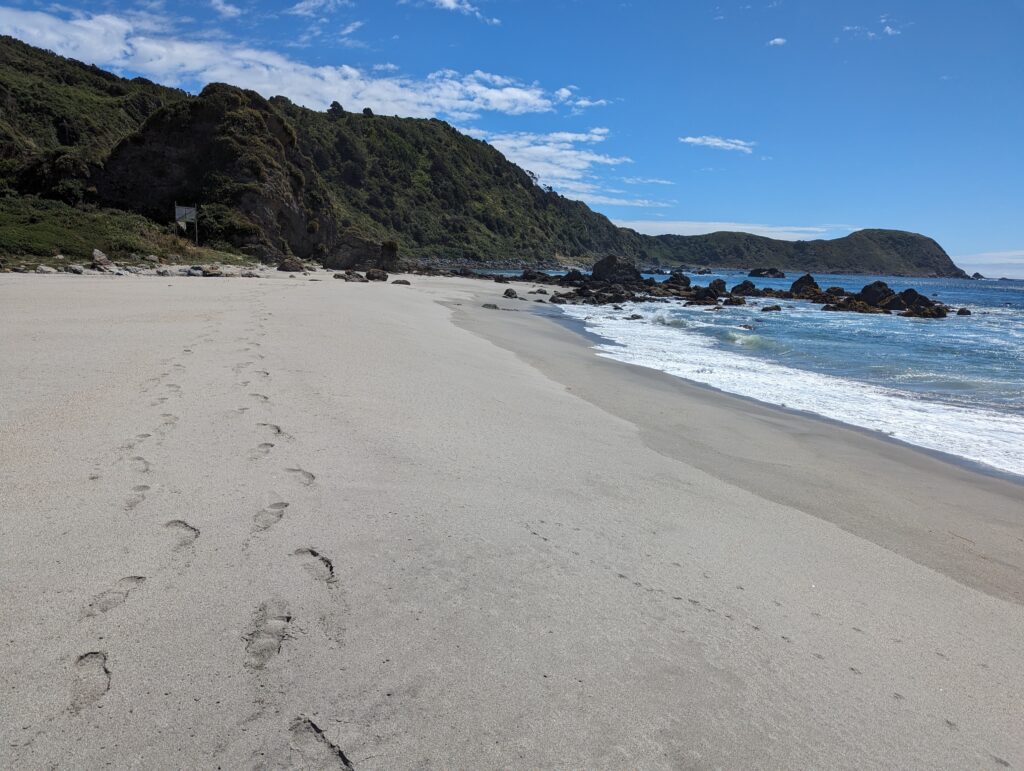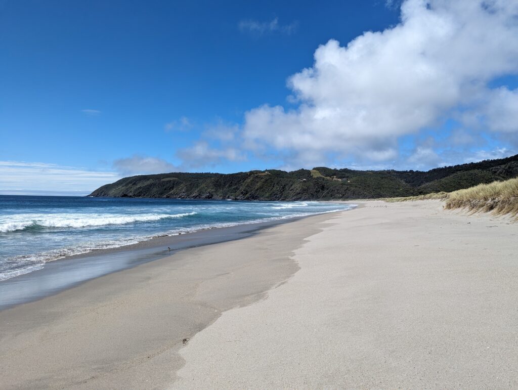 On a été très content du tour. Sur la fin, le guide nous parle d’une plage magnifique où l’eau est bleue azuré. On s’y dirige donc pour pic niquer. La route n’est pas simple, là on a du bon ripio qu’on aime. On descend une pente très raide qui donne sur… un chantier. ah bon… On remonte la voiture, on descend à pied. On va à la plage. Elle est… pas folle. Et il y a plein de vent. Petite vérification rapide… ce n’est pas la bonne plage. Il faut retourner au point de départ…
