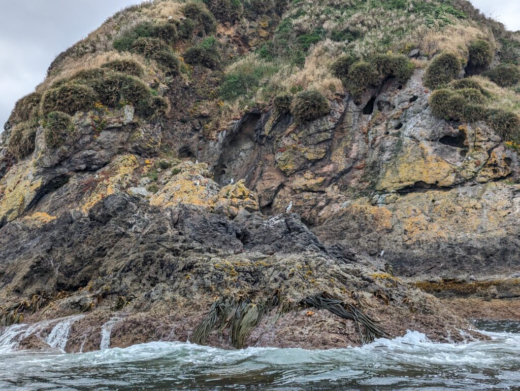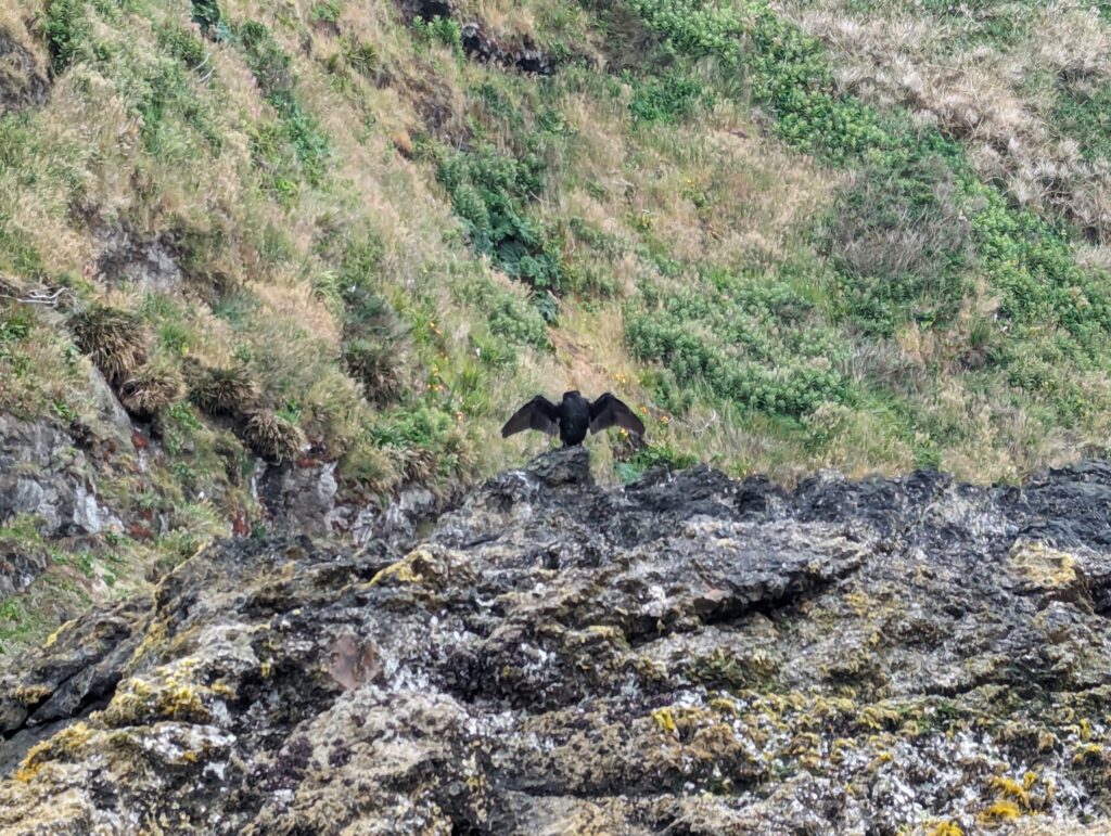 Il parle des pingouins, qu’en ce moment ils apprennent aux petits à nager (on en a vu !). Il nous dit qu’ils sont monogames et si la mère meurt, le mari meurt d’amour, ce qui est apparemment vérifié. Il parle aussi des autres oiseaux, ceux qui mangent les œufs de pingouins, ceux qui se mettent sur la falaise car les autres arrivent pas a s’y mettre, etc…