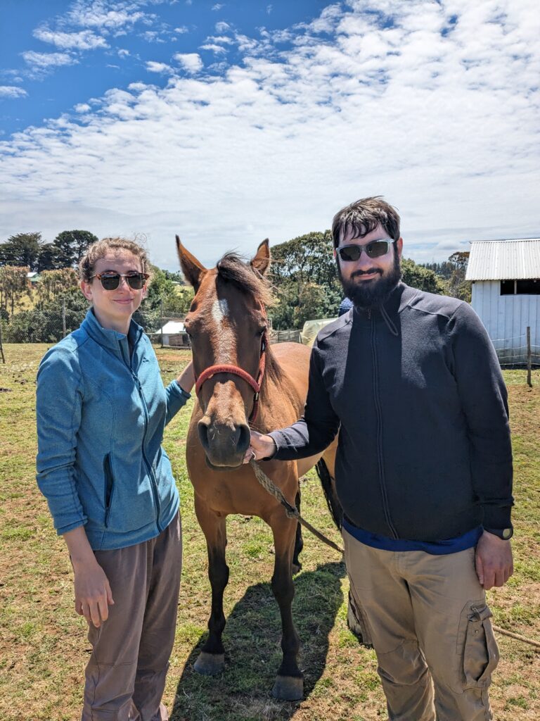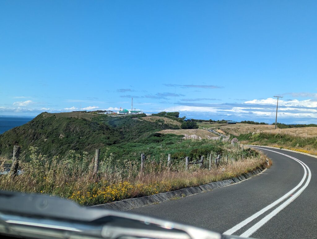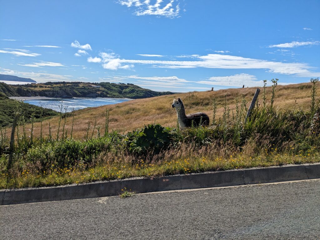 On arrive, on croise des lamas dans des champs juste avant le phare. Et là, on voit des grosses barrières, et un panneau indicant que c’est une zone interdite appartenant à l’armée… Ah mince ^^. On s’approche quand même, on peut le visiter mais aujourd’hui c’est fermé ! Raté !