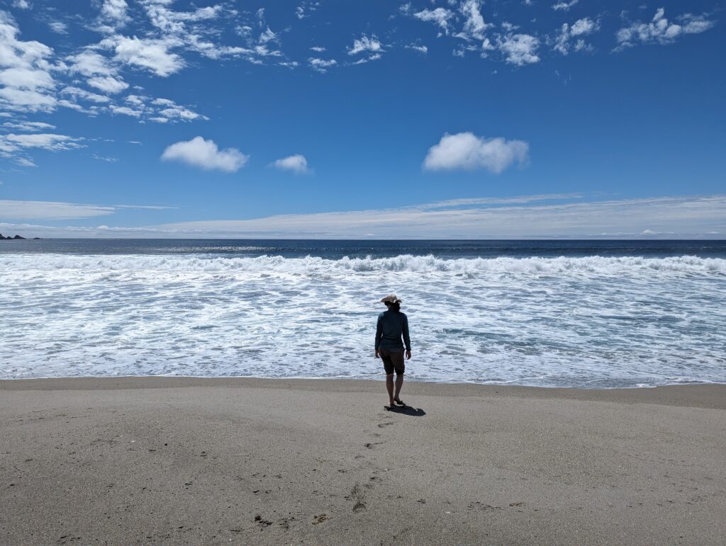 On s’enfonce un peu sur la plage, et là… retour des taons… Rhaaaaaaa sales bêtes ! On décide de se poser un peu et de gouter l’eau, impossible pour moi d’enlever mes chaussures j’en ai en permanence 3 sur moi… Avec l’aide d’Elena qui les chasses je finis par y arriver, et on va gouter l’eau. Ben elle n’est pas plus chaude qu’à Cucao ! Donc pas de regret d’avoir oublié le maillot de bain…