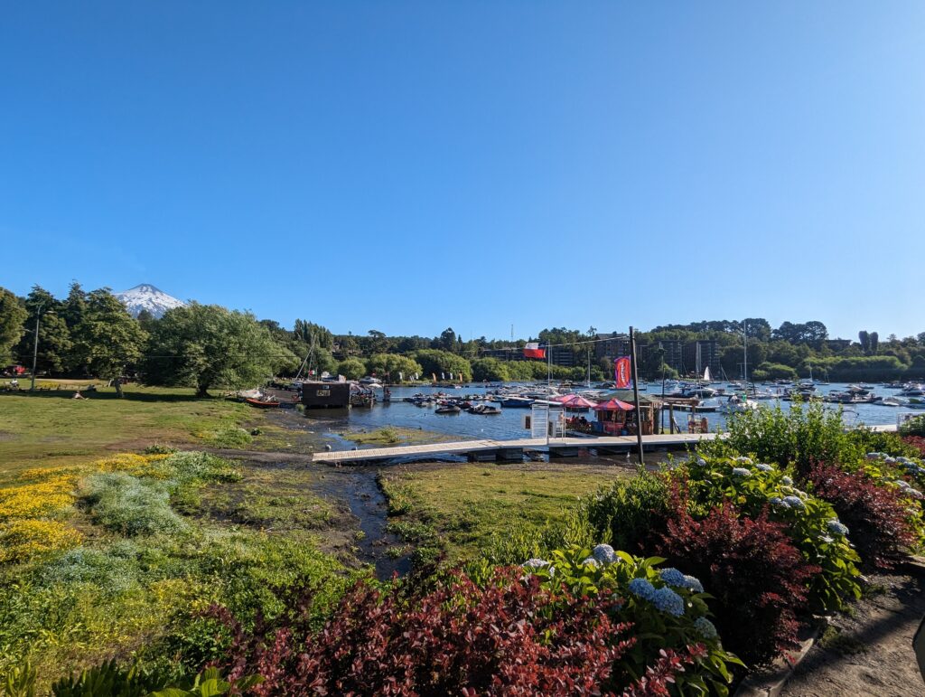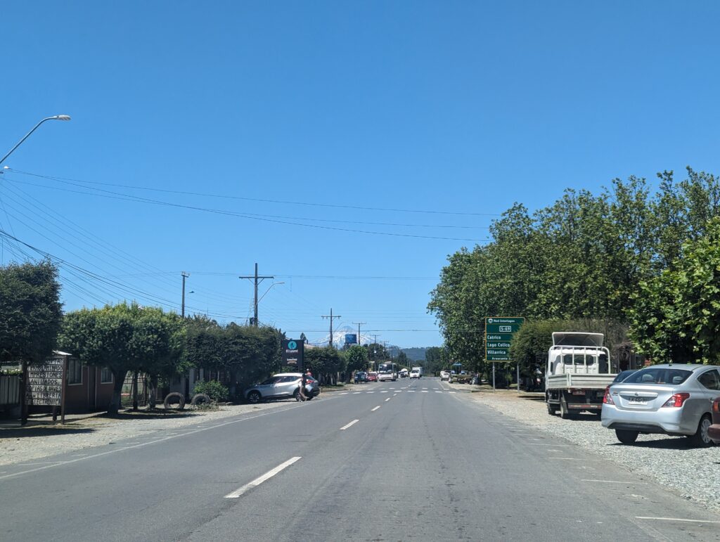 Après un passage à Villarrica pour retirer de l’argent au distributeur qui s’est avéré en panne, on tombe sur un bouchon le long du lac où sont garées énormément de voitures de familles qui vont à la plage. On sent qu’on arrive à une destination très touristique !