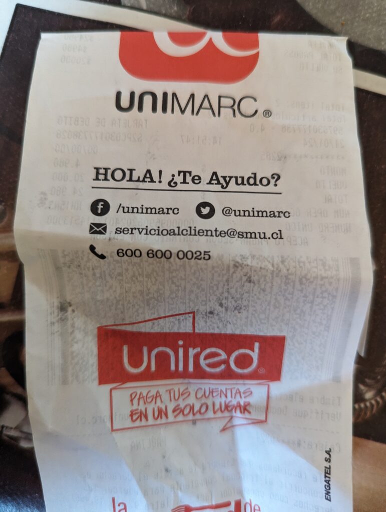 Avant de rentrer, on passe par Unimarc faire du Vuelto. Petit point argent au chili. La plupart des banques prennent une commission fixe entre 5€ et 8€ lorsque vous retirez de l’argent. La seule qui le fait pas (Scotiabank) n’est pas la banque la plus populaire et elle pas présente partout. Heureusement, il est possible de retirer de l’argent au supermarché avec ce qu’ils appellent le Vuelto ! Ça consiste, au moment de payer avec la carte, d’augmenter le montant, et le reste est rendu sous forme d’espèce. Comme le distributeur Scotiabank le plus proche était cassé, on est allé au supermarché tous les jours pour retirer de l’argent !