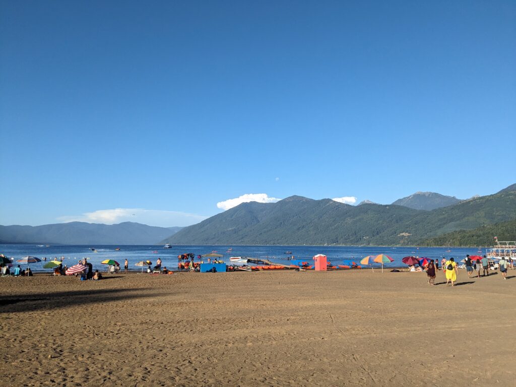 Une fois à la maison, repos ! …Ah non c’est vrai notre appart c’est un four. On tente quand même de se reposer sans grand succès… En fin d’après-midi, on décide d’aller au lac Caburgua se baigner ! On croise énormément de monde sur le retour, on se dit qu’on a bien fait de ne pas partir trop tôt. On arrive à la Playa Negra (la Blanca étant, d’après le routard, noir de monde !), et on se gare juste avant un panneau d’interdiction de stationner car la place est libre. En théorie, l’interdiction commence après, Elena est sûre, moi un peu moins mais de toute façon vue le nombre de voitures garées pas de soucis.