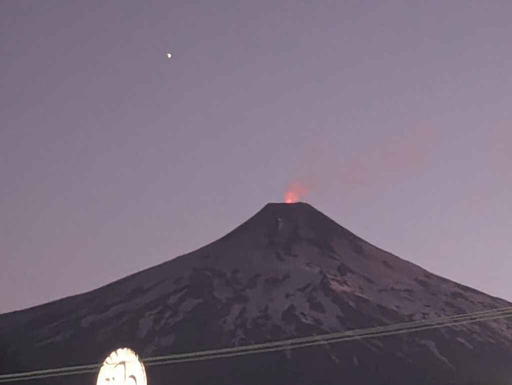 Après 20 min de recherche du meilleur emplacement (pas trop de lumière, pas trop glauque, confortable), on s’assoit par terre dans la pelouse à coté de… Unimarc ! Ce qui ressemblait à de la lave de loin n’était en fait que de la fumée éclairée par la lave en dessous, mais qui ne dépassait pas du cône… Enfin presque pas, car sur l’heure d’observation, on l’a vu sortir par 3 fois aux jumelles !