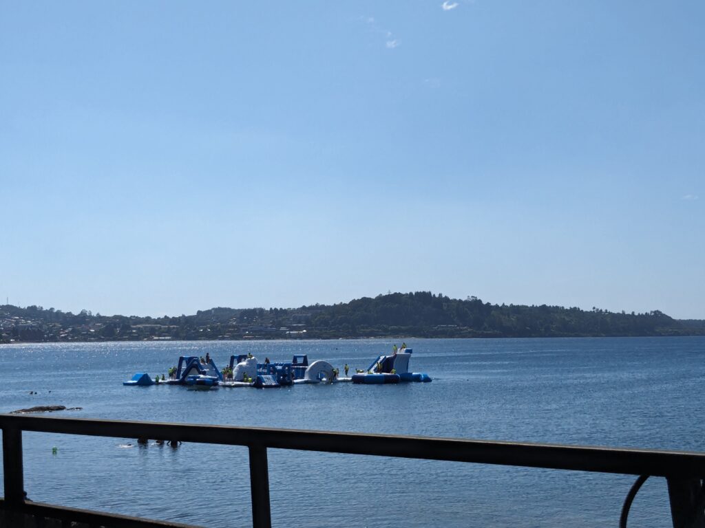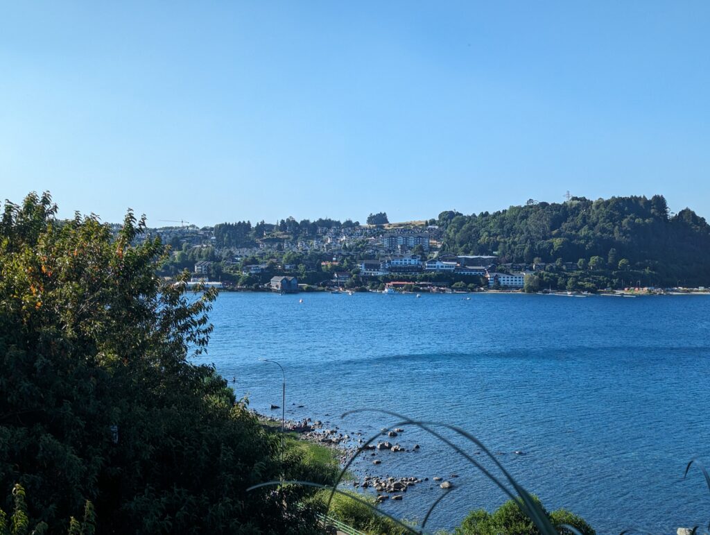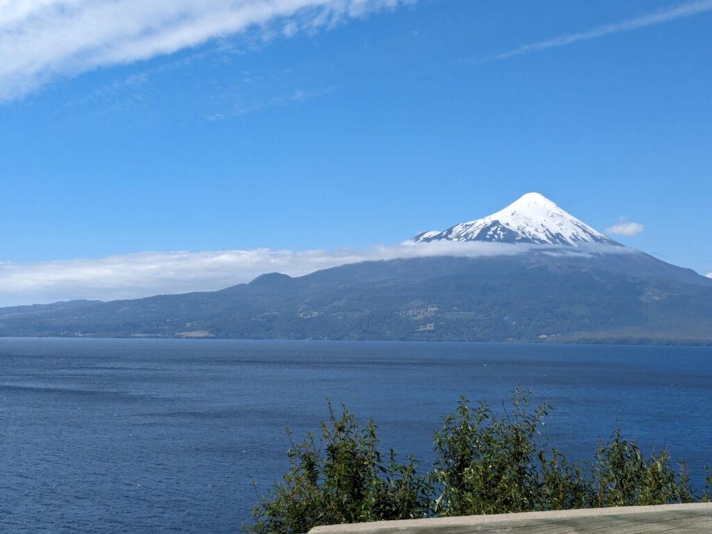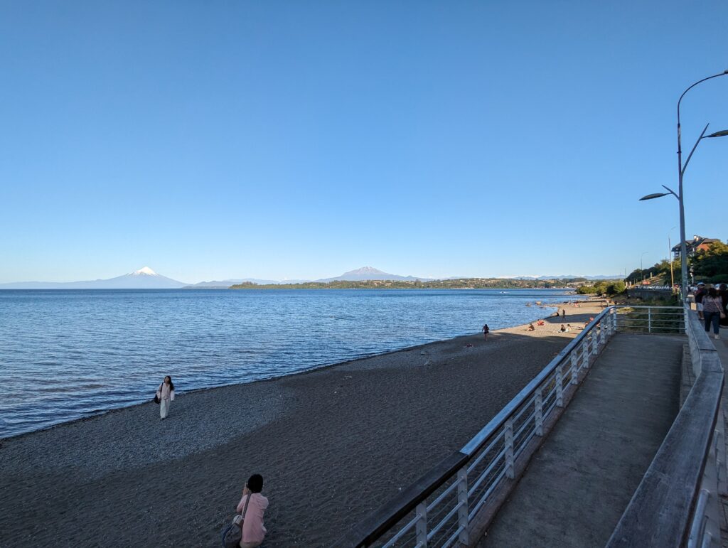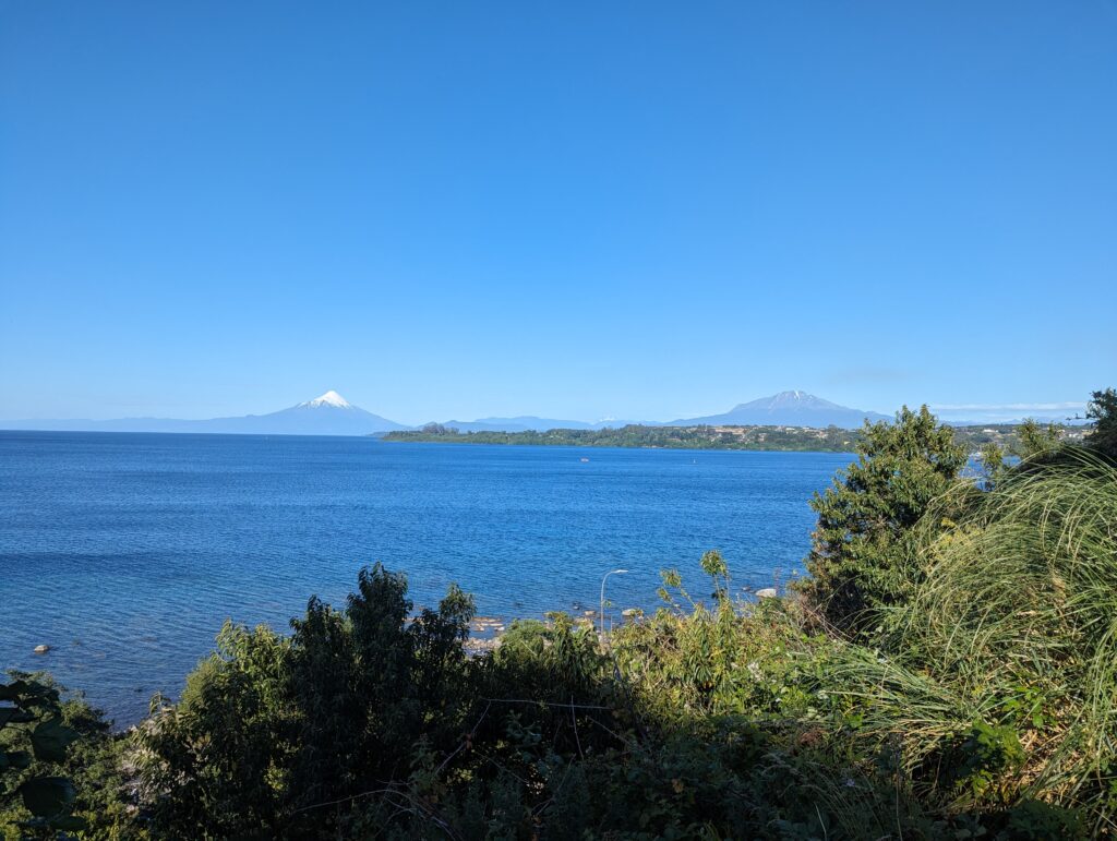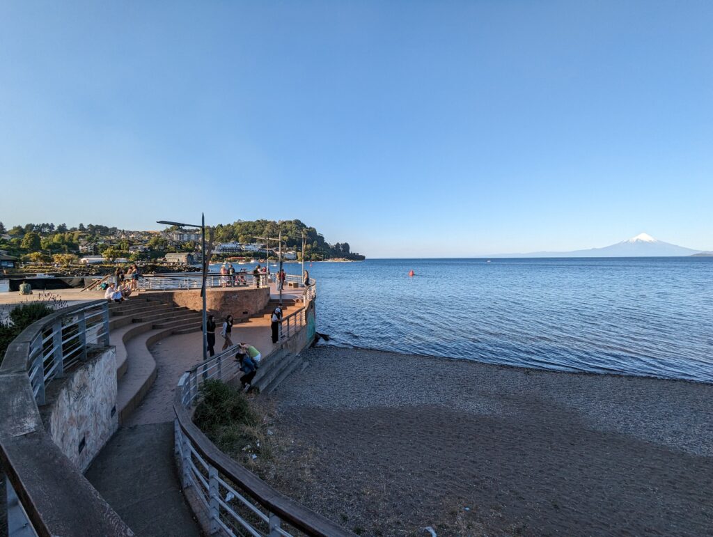 Bon au moins c’est fait. On peut enfin se détendre et aller retirer de l’argent à Scotiabank pour notre prochaine destination, tout en visitant un peu la ville. La balade est plutôt agréable. On prend un sentier piéton qui longe la colline surplombant le rivage et la descend. On a une superbe vue sur Osorno et ce que je pense être 2 autres volcans. Le sentier nous mène tout droit au centre.