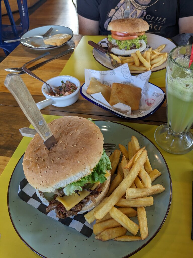 On part donc à 15h. Première chose, on cherche où manger car le brunch était léger, et on commence à avoir sacrément faim ! Nous choisissons donc de gouter un plat de plus en plus apprécié au Chili d’après le routard : le burger ! La route est plutôt belle le long du lac, mais il y a beaucoup de voiture. Heureusement le trajet n’est pas trop long et on y est en 45 min.