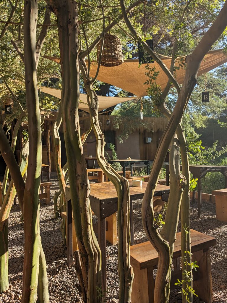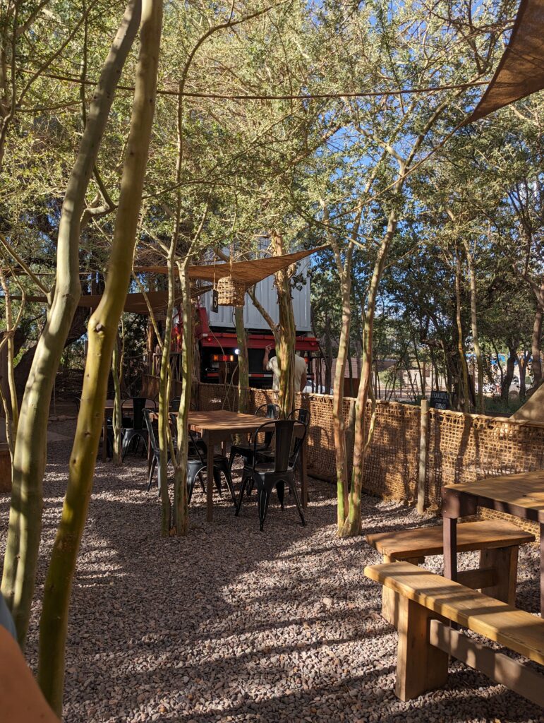 On arrive sur place, le coin est vraiment sympa. On mange à l’extérieur au milieu des arbres donc il n’y fait pas trop chaud, voire même frais. Par contre, le serveur nous demande de nous assoir loin de l’allée, là où il y a moins d’ombre…. On comprend vite pourquoi. Avant de manger, on a le droit à un spectacle étonnant : un gros camion transportant une maison préfabriquée sous forme de conteneur doit passer par l’allée au milieu des arbres, où, de toute évidence, il n’y a clairement pas la place….